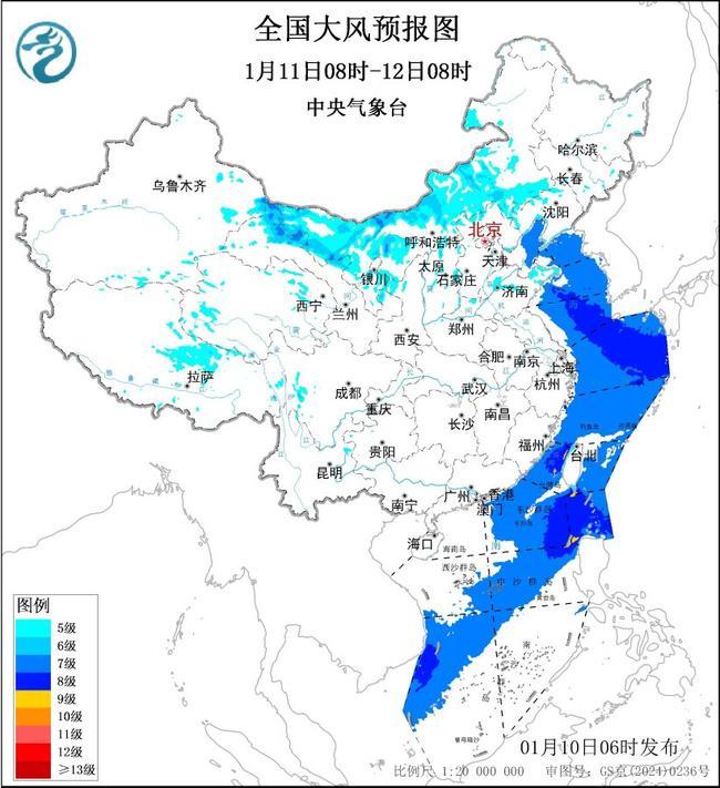 预计,1月10日8时至11日8时,西藏西部、甘肃北部、内蒙古中东部、陕西北部、华北、山东、辽东半岛等地部分地区有5~6级大风、阵风7~9级;渤海、渤海海峡、黄海大部海域、东海大部海域、台湾海峡、台湾以东洋面、巴士海峡、南海东北部和中部海域、南海西南部海域将有7~8级、阵风9~10级的大风。