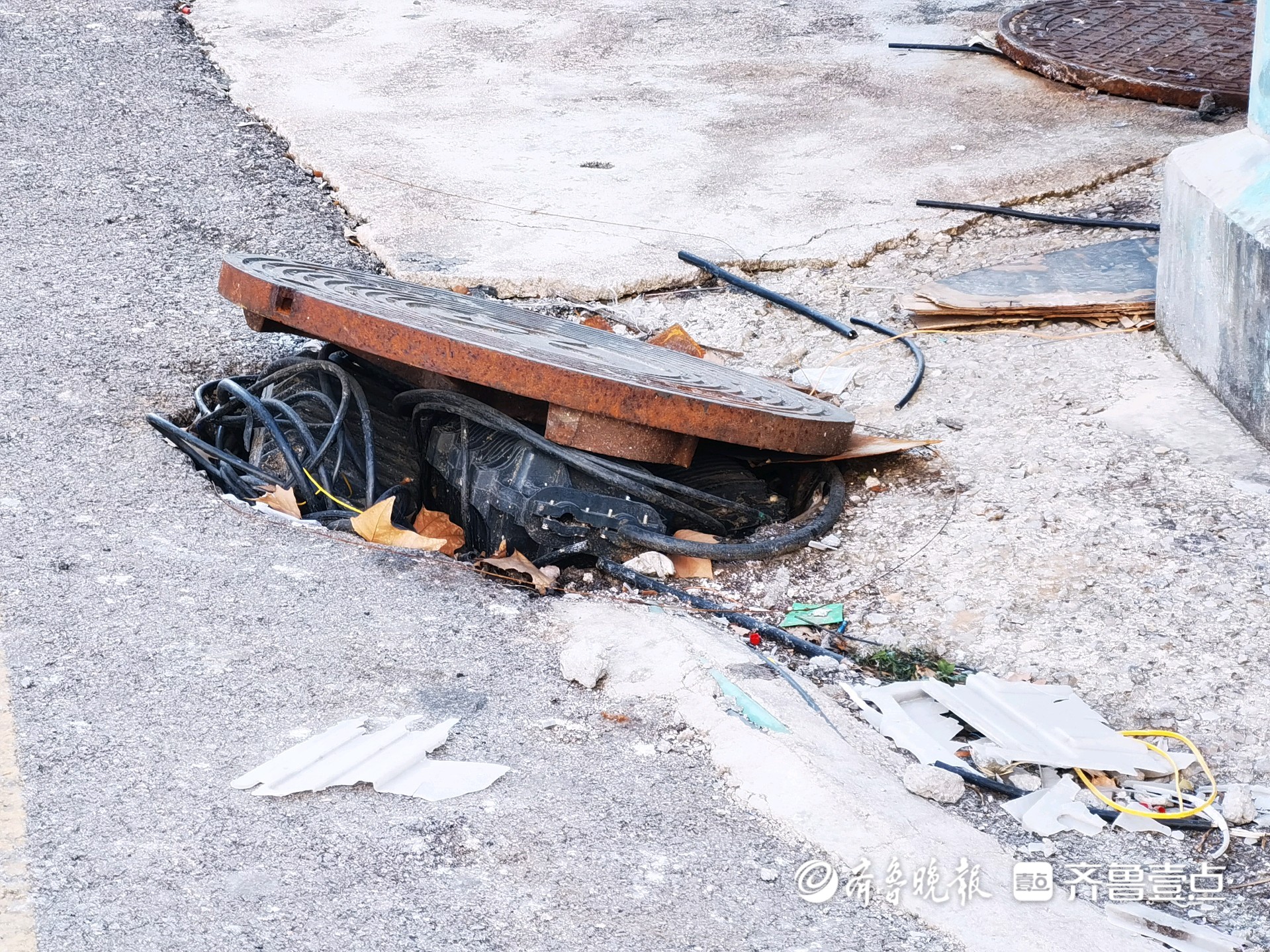 情报站·随手拍|济南建设路一井盖翘起线缆外露,影响市容存隐患