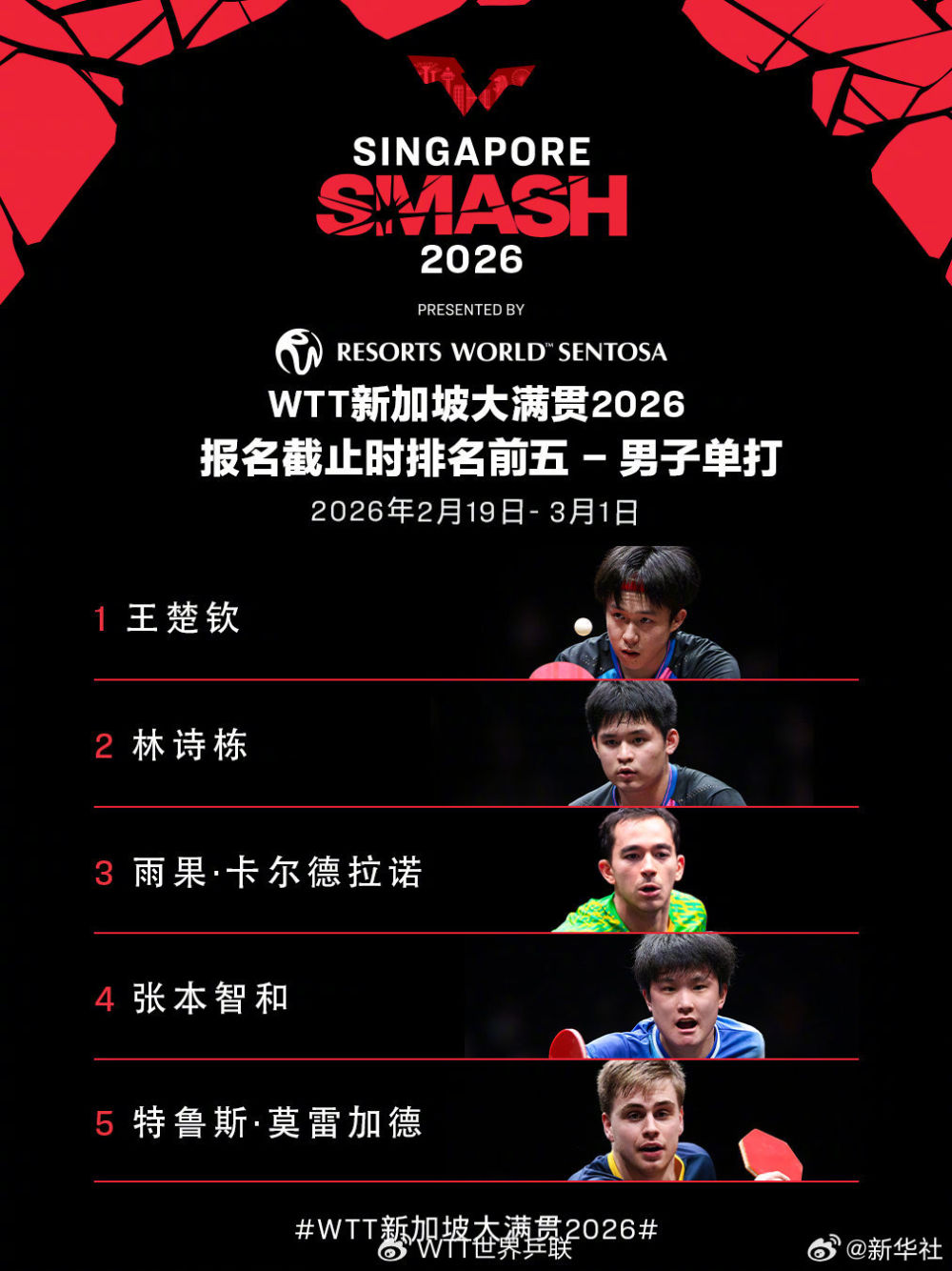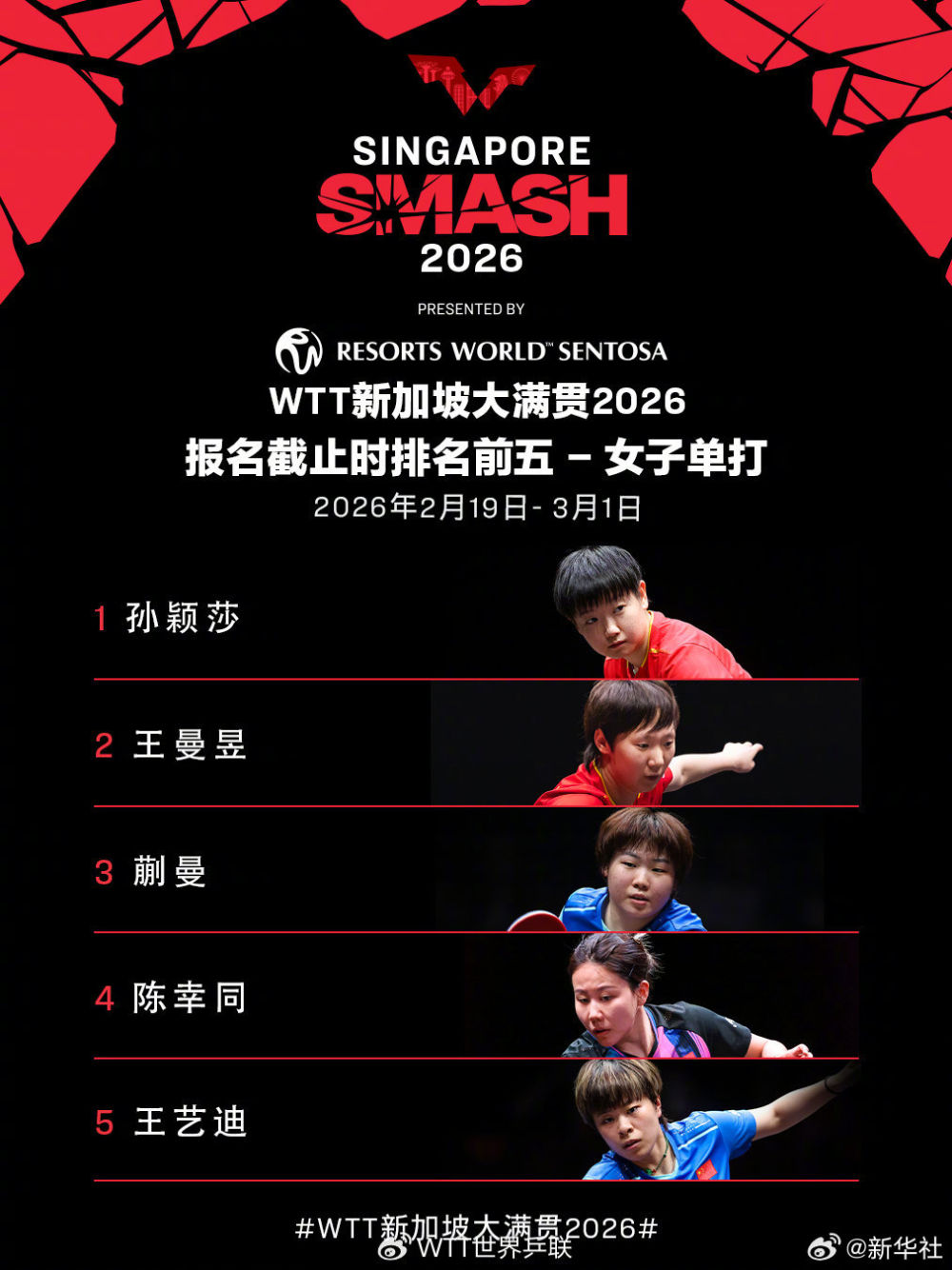 WTT新加坡大满贯首批参赛名单公布新华社微博 2026-01-10 14:12:14WTT新加坡大满贯2026将于2月19日至3月1日在新加坡体育中心举行。WTT世界乒联公布首批参赛名单。一起期待!责任编辑:金雪