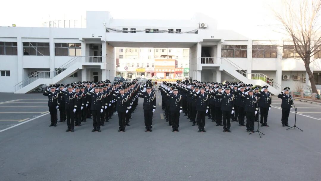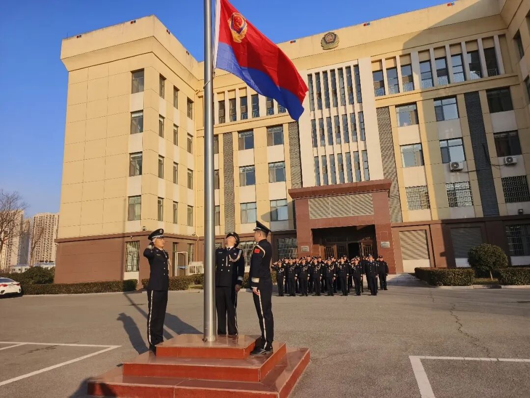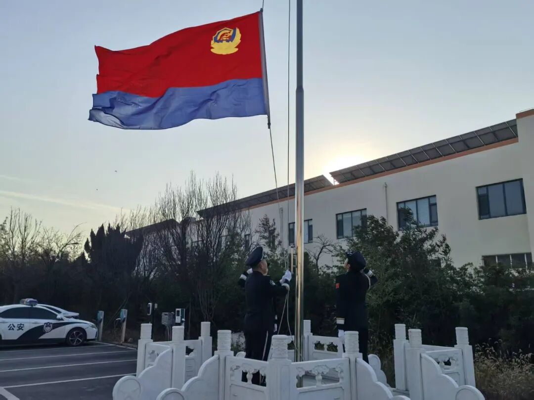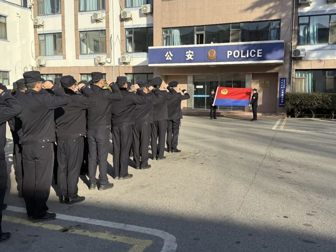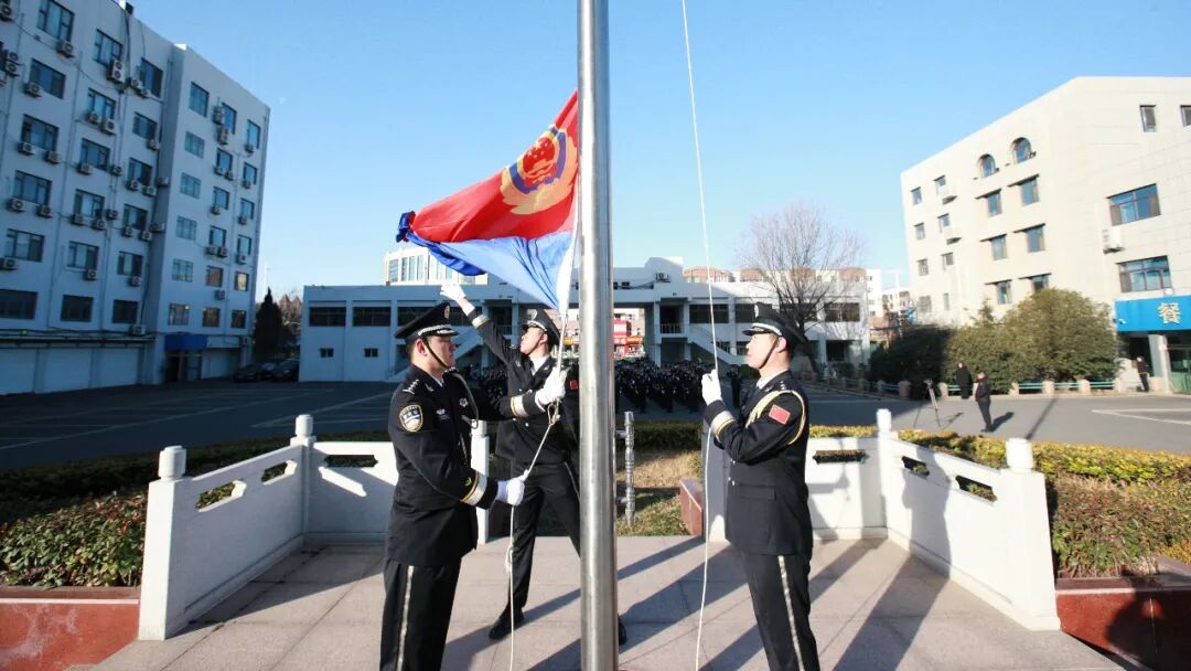 1月10日上午,青岛市公安局城阳分局举行升警旗仪式。护旗仪仗队伍英姿挺拔、精神抖擞,迈着整齐的步伐,护送警旗入场。