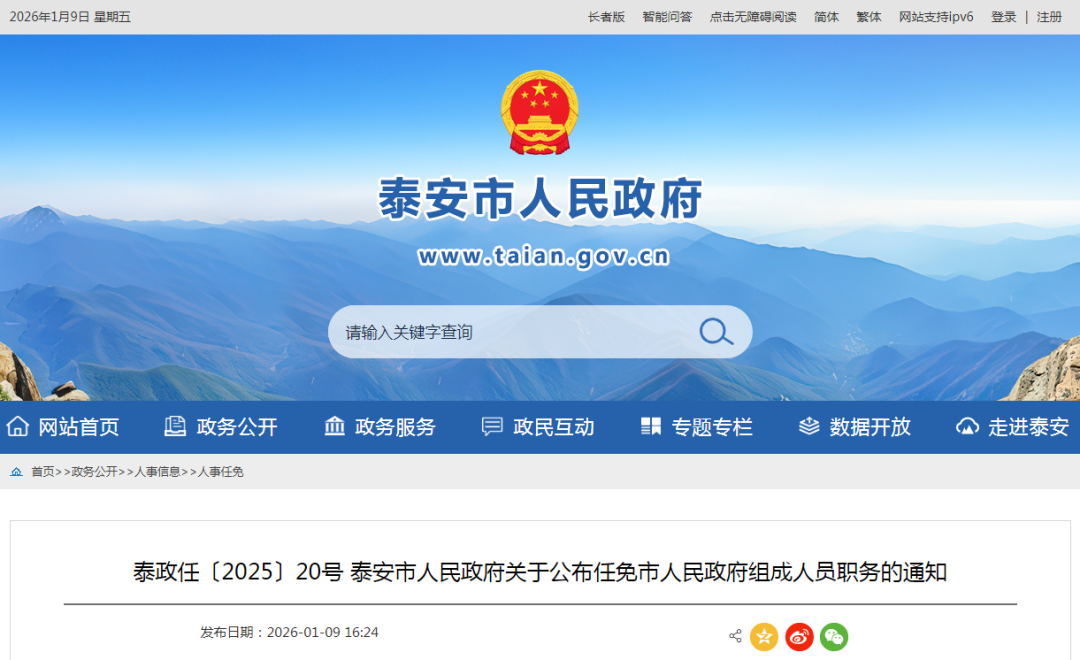 1月9日泰安市人民政府网站发布泰政任〔2025〕20号泰安市人民政府于公布任免市人民政府组成人员职务的通知。