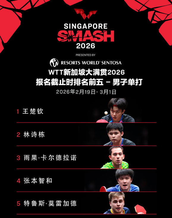 WTT新加坡大满贯2026由新加坡圣淘沙名胜世界呈献,将于2026年2月19日至3月1日在新加坡体育中心举行。届时世界顶尖运动员将齐聚狮城,共同争夺2000点世界排名积分。报名截止时排名前五名单如下: