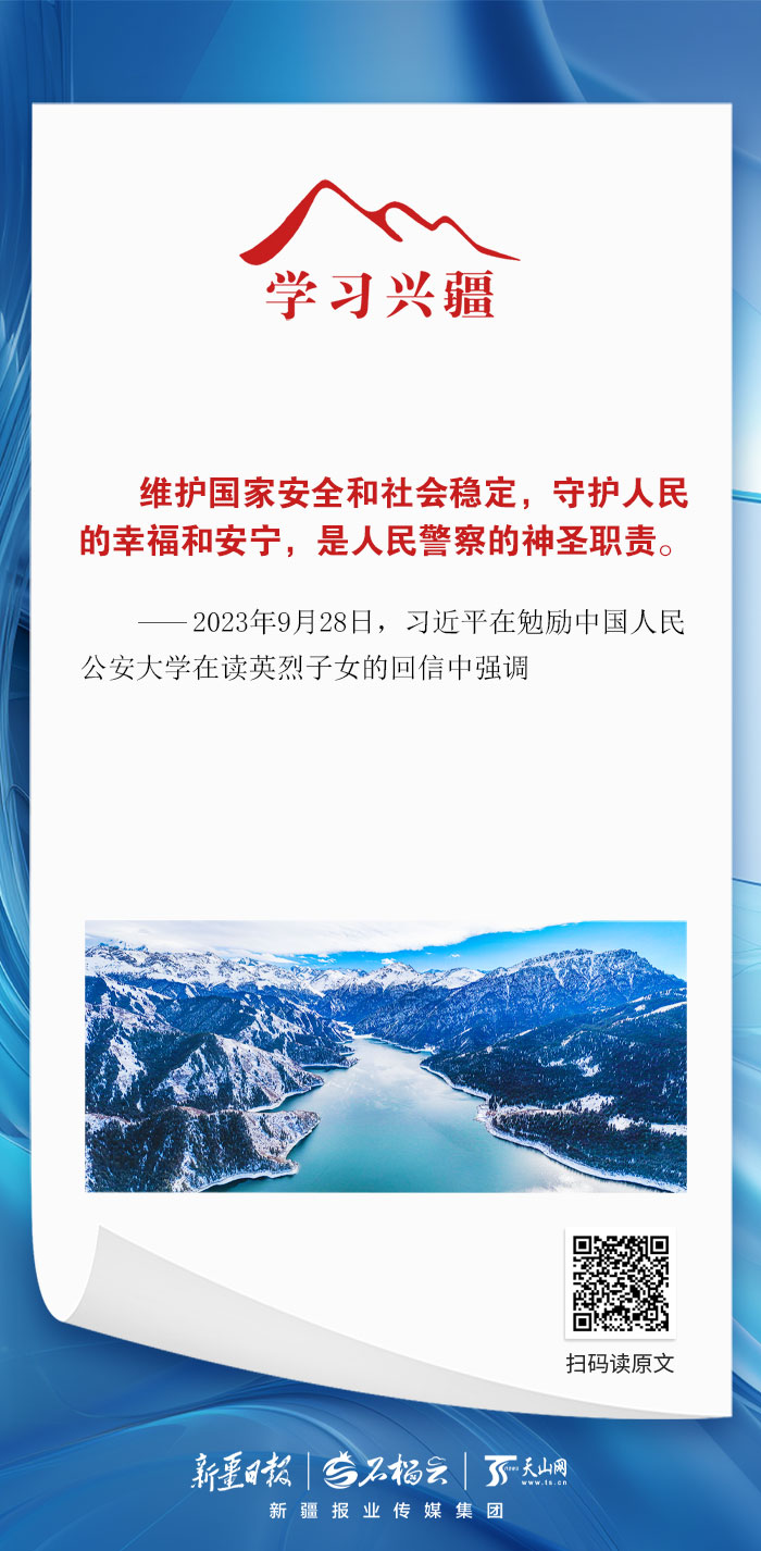 学习兴疆丨维护国家安全和社会稳定,守护人民的幸福和安宁,是人民警察的神圣职责天山网 2026-01-10 17:28:39维护国家安全和社会稳定,守护人民的幸福和安宁,是人民警察的神圣职责。——2023年9月28日,习近平在勉励中国人民公安大学在读英烈子女的回信中强调责任编辑:阿依提拉·图尔荪