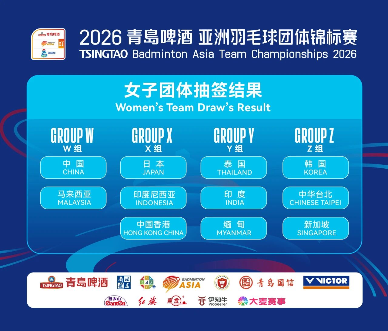 女团其他分组情况:X组汇集日本队、印尼队和中国香港队;Y组由泰国队、印度队和缅甸队组成;Z组则包括韩国队、中国台北队和新加坡队。
