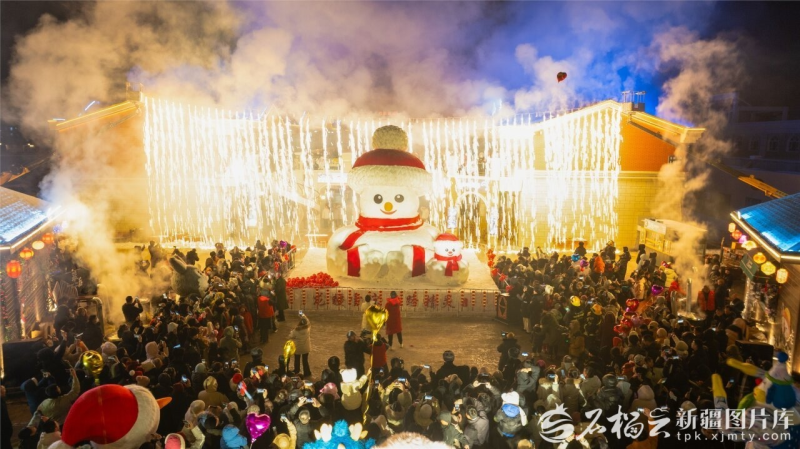 2025年12月27日晚,游客在北屯市龙疆小镇丝路风情街观看烟花瀑布。李正虎摄