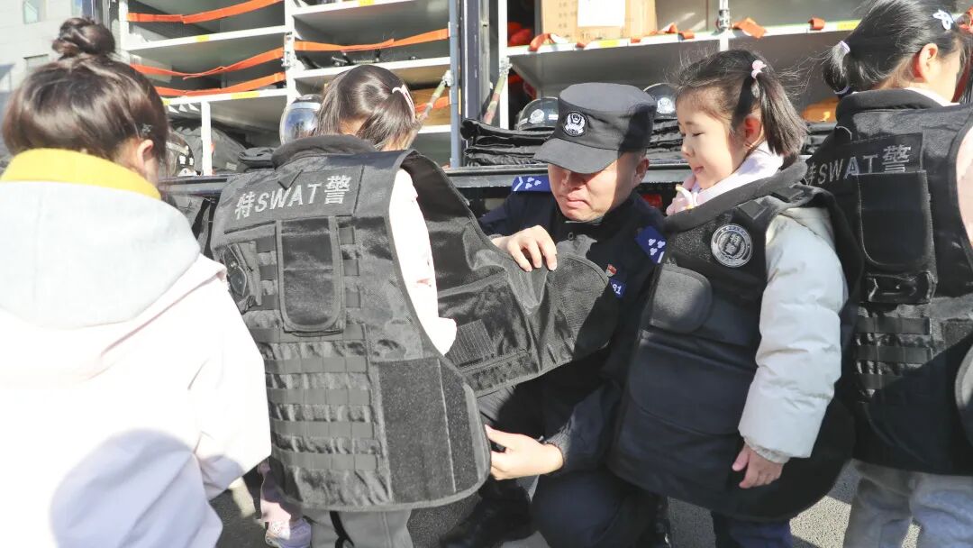 活动中特别设置了互动体验环节。孩子们在指导下尝试穿戴特警装备,学习基础的安全知识与自我保护技能。民警们结合生活场景,用生动的语言和情景演示,将出行安全、防拐防骗等知识融入轻松有趣的交流中,在孩子们心中悄然播下安全意识的萌芽。