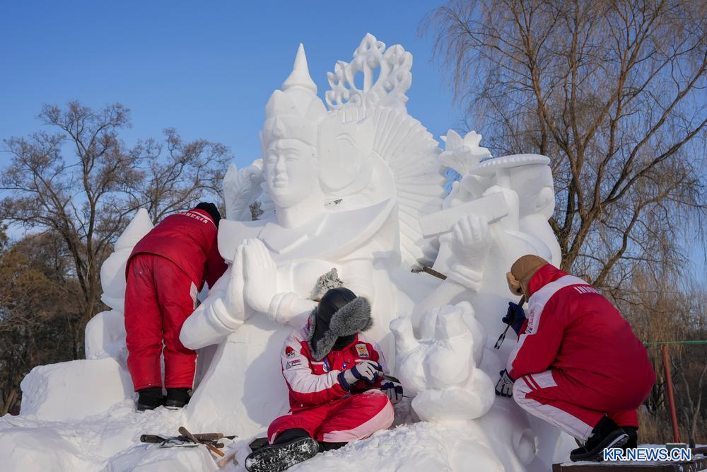 8일 하얼빈(哈爾濱) 타이양다오(太陽島) 국제눈조각예술박람회 단지에서 열린 '제28회 중국∙하얼빈 국제눈조각대회' 현장에서 선수들이 눈 조각을 만들고 있다.