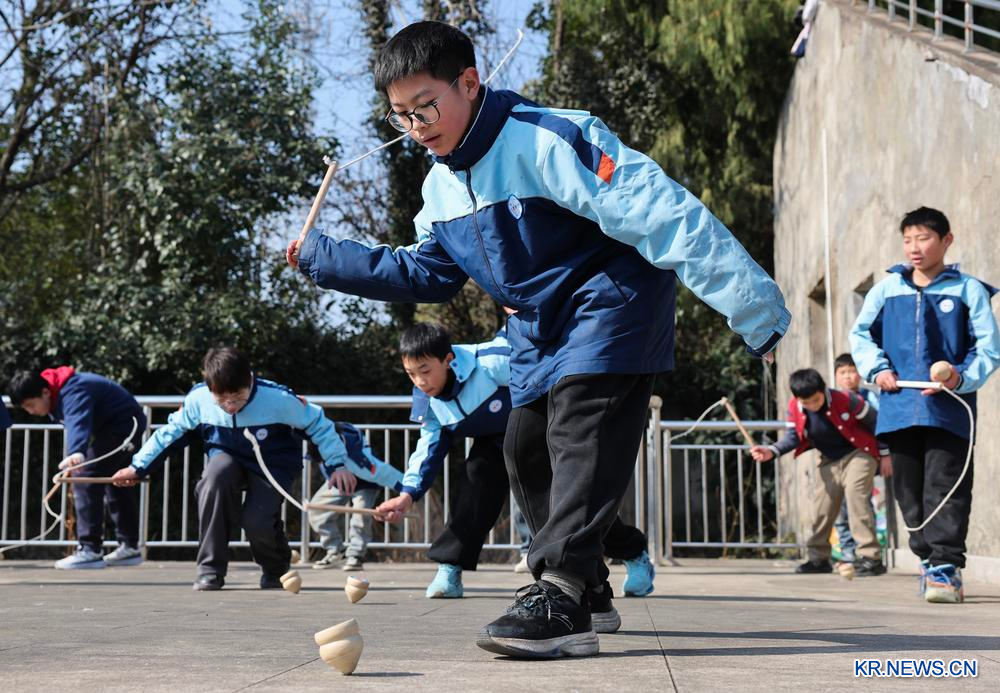 9일 저장(浙江)성 주지(諸暨)시의 한 초등학교 학생들이 운동장에서 팽이를 치며 즐거운 시간을 보내고 있다.