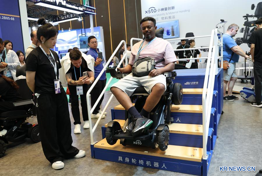 한 바이어가 2025년 10월 31일 '제138회 중국수출입박람회(캔톤페어)' 스마트 의료 전용구역에서 로봇 휠체어를 체험하고 있다. (사진/신화통신)