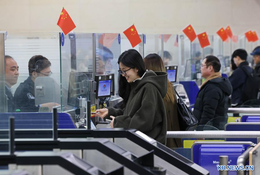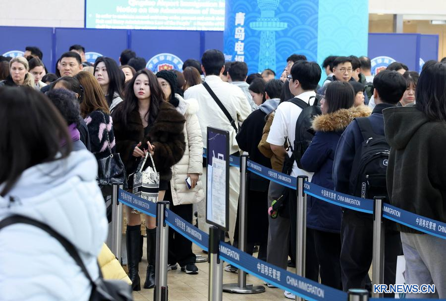 2025년 12월 31일 칭다오(青島)공항에서 이민관리 경찰이 한국에서 온 여행객들을 대상으로 입경 수속을 진행하고 있다. (사진/신화통신)