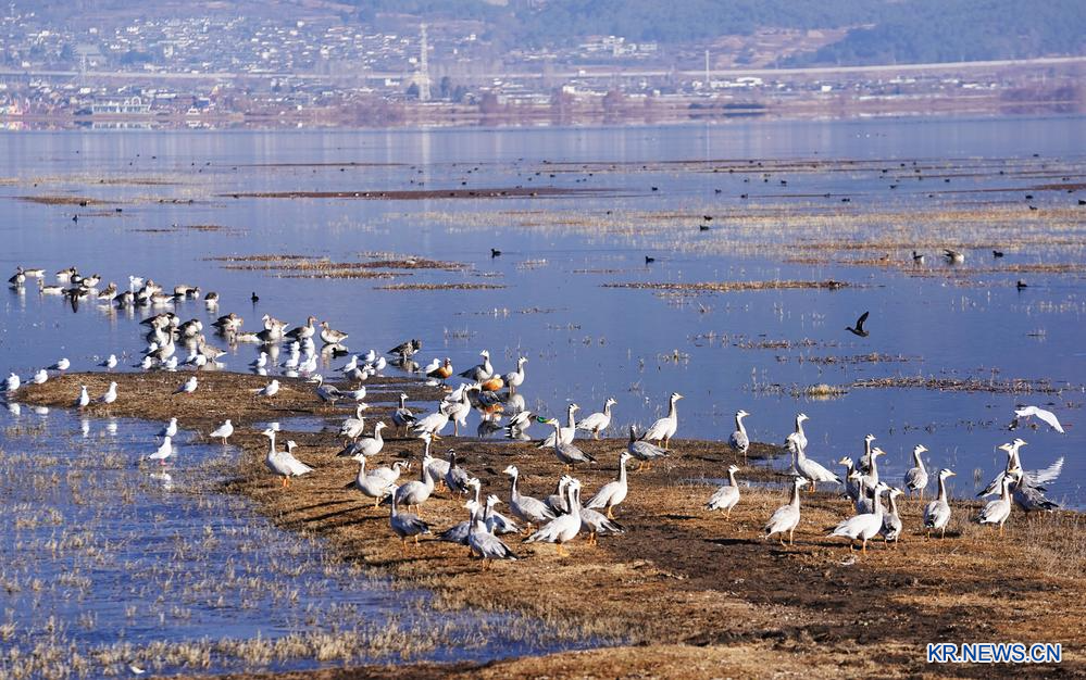 지난 6일 윈난(雲南)성 리장(麗江) 라스하이(拉市海) 자연보호구에서 노닐고 있는 철새들의 모습.