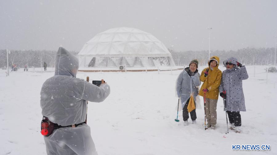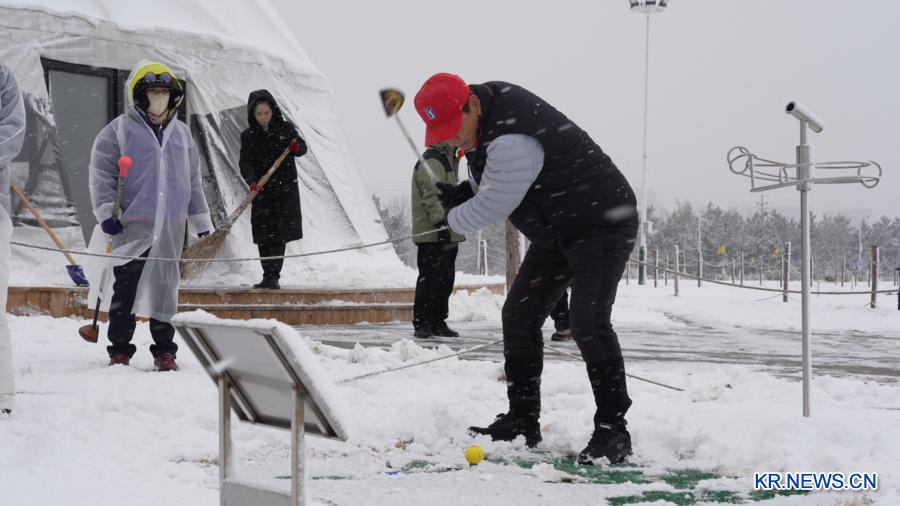 2025년 12월 4일 눈이 내리는 웨이하이에서 파크골프를 즐기는 한국 관광객. (취재원제공)