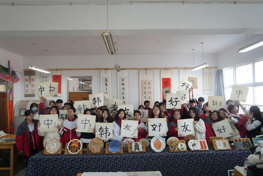 교정 참관, 수업 체험도 진행됐다. 특히 미술 수업에서 중·한 양국 학생들은 함께 중국 전통 서예의 매력을 느끼며 '중한우호(中韓友好)'라는 네 글자를 썼다.