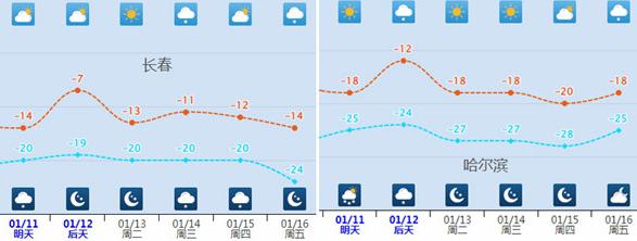 东北地区冷空气频繁影响,且降雪也比较频繁,今后7天气温总体较常年同期偏低,三九严寒本色尽显。像长春,明起6天有5天最高气温都在-10℃以下,哈尔滨最高气温也大多维持在-18℃上下。