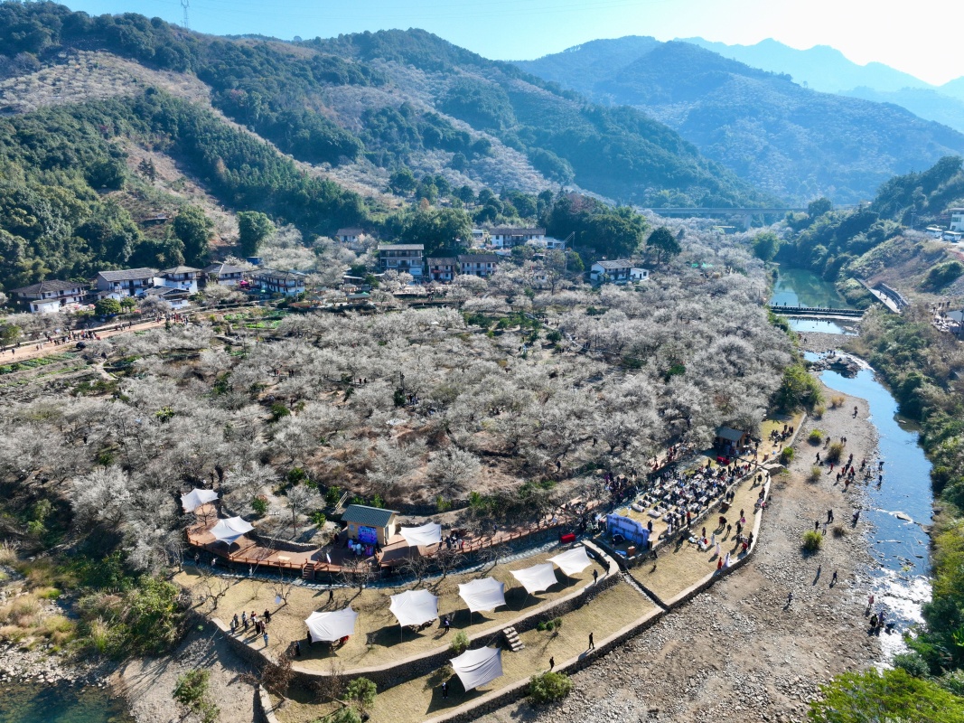 1月10日,游客在福建省永泰县葛岭镇文埕湾赏梅、游玩(无人机照片)。新华社