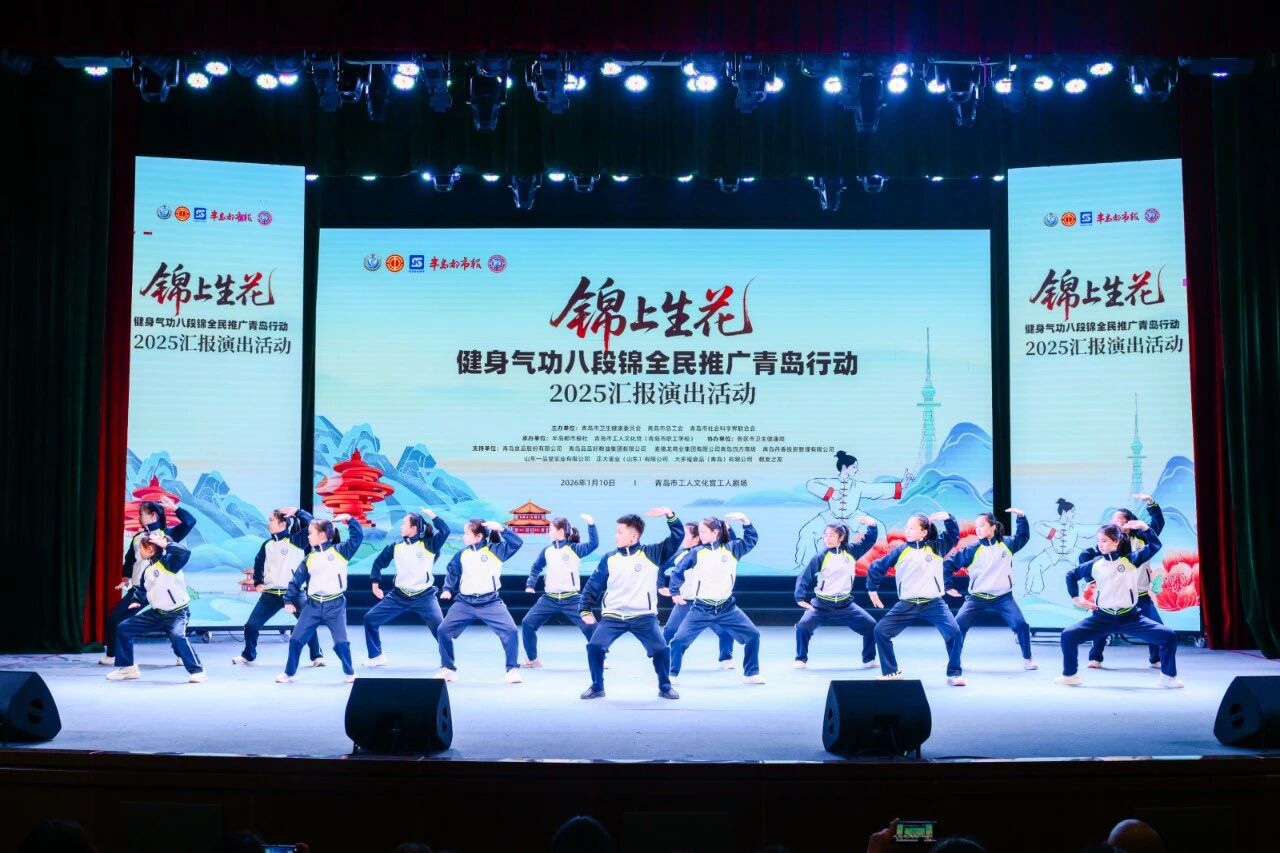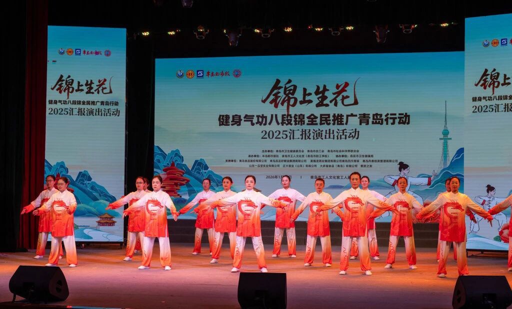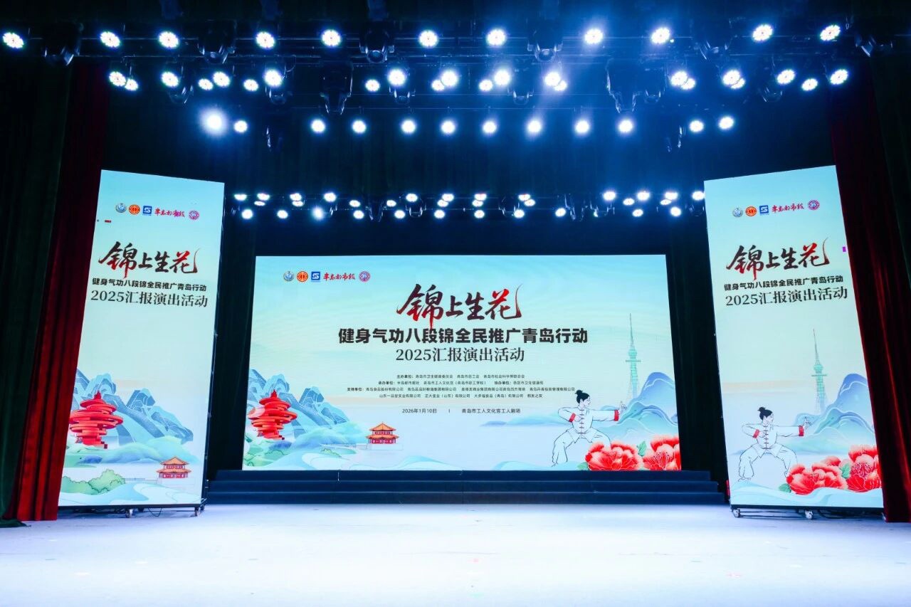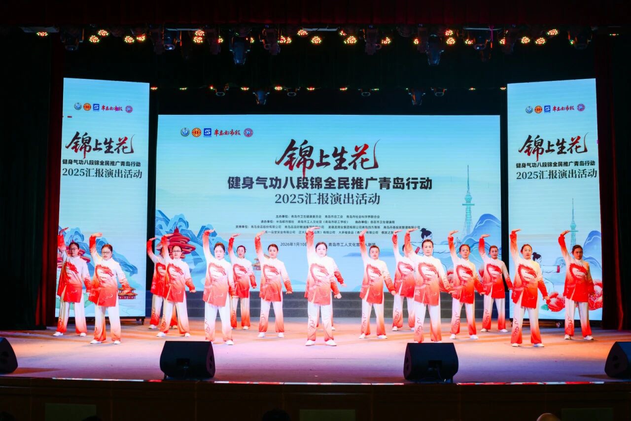 新年伊始,万象更新。1月10日上午,“锦上生花”健身气功八段锦全民推广青岛行动汇报演出活动,在青岛市工人文化宫成功举行。本次活动由青岛市卫生健康委员会、青岛市总工会、青岛市社会科学界联合会联合主办,半岛都市报社与青岛市工人文化宫承办,各区市卫生健康局协办,旨在系统总结2025年八段锦推广工作的丰硕成果,表扬在行动中涌现出的优秀站点、团队和个人,并通过一系列融合创新的文艺展演,展现传统养生功法与现代生活的深度融合,营造全民参与、共享健康的城市氛围。
