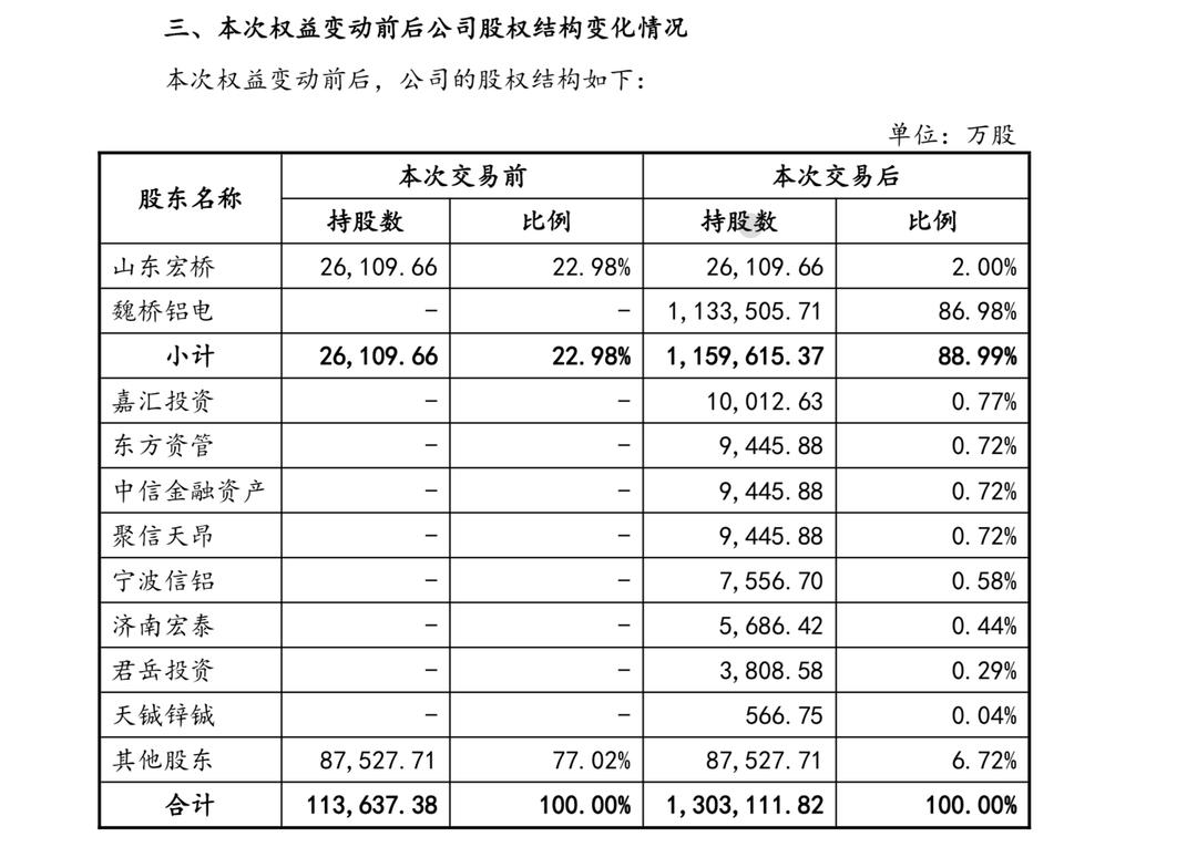 本次增发发行价格为5.34元/股,数量为118.95亿股,上市日期为2026年1月13日。权益变动后,宏创控股总股本增加至130.31亿股。其中,魏桥铝电持有公司113.35亿股,占公司总股本的86.98%,变更为公司控股股东;公司原控股股东山东宏桥新型材料有限公司(下称“山东宏桥”)持有公司2.61亿股股份,占发行后公司总股本的2.00%。宏创控股的实际控制人仍为张波、张红霞及张艳红。