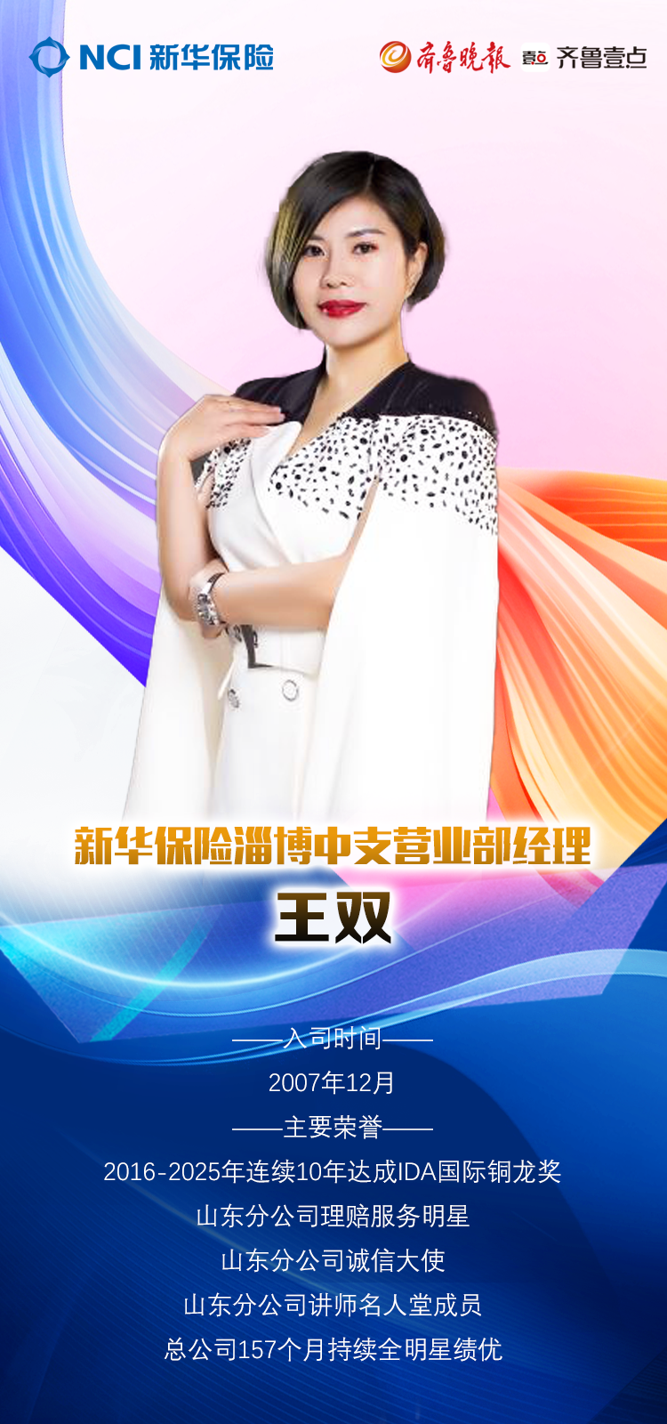 王双于2007年12月1日入职新华保险淄博中支营销渠道,通过不断的学习和积累,她从保险行业的小白,一步步成长为一名优秀的保险人,目前团队人力已达100余人。从事保险行业16年,保险对于王双来说已经不仅仅是一份工作,而是一生都要用心经营的事业。对客户许下的承诺和最初入行的初心让她不断向前,成为更好的保险人。这份对事业的无限热爱,让王双在职业生涯中获誉无数。她是总公司四星级讲师,山东分公司讲师名人堂成员,2016-2025年持续10年达成国际IDA龙奖,总公司157个月持续全明星绩优,她还是山东分公司“理赔服务明星”。