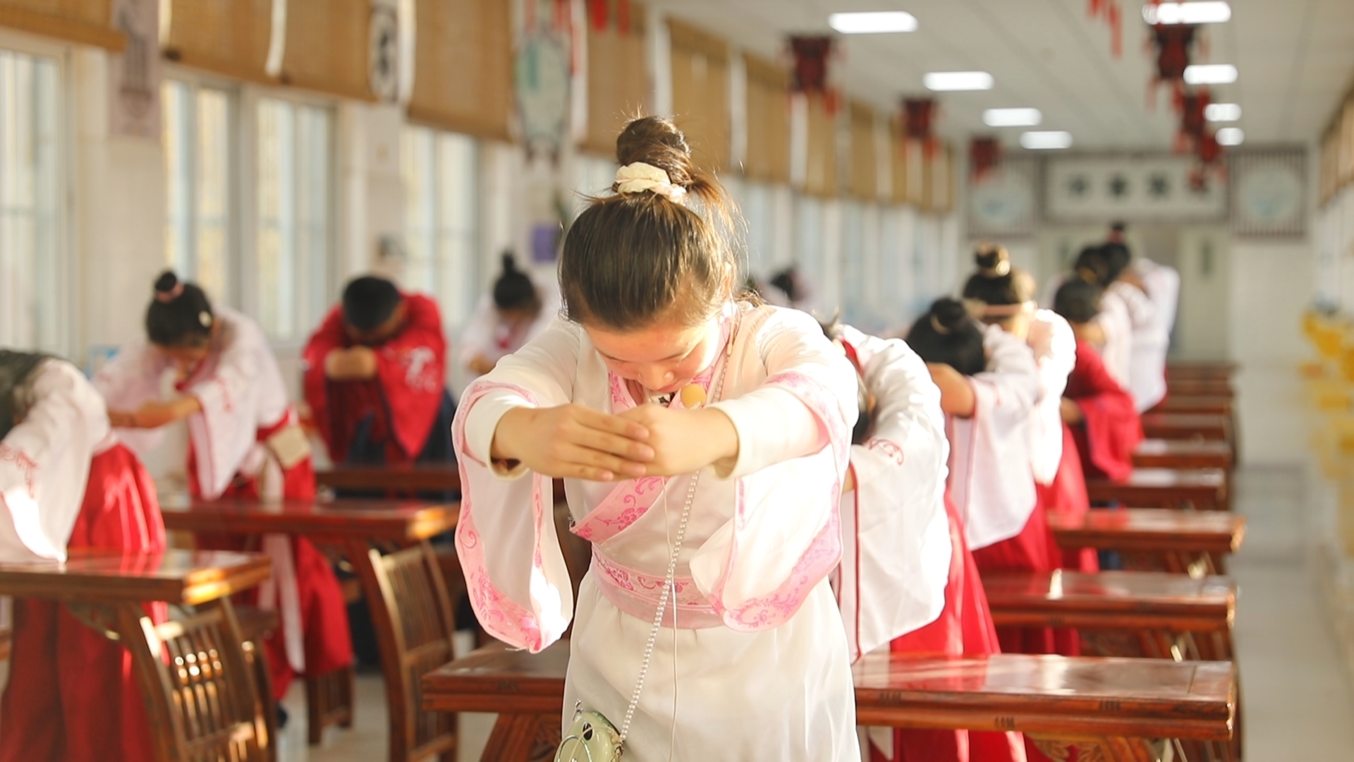 如果说实验中学的特色是 “本草飘香”,天津路小学则以 “儒韵流芳” 勾勒出校园文化的别样景致。该校以国学经典与非遗传承为双翼,让传统文化浸润童心成长。在 “儒韵流芳” 孔子学堂内,一场别开生面的《国学经典》展示活动正在上演:学生们身着典雅汉服,以庄重的三鞠躬礼拉开序幕,随后用轻快节拍齐声诵读《千字文》,又以时尚说唱的形式演绎《大学》中的经典名句,经典底蕴与创意表达碰撞出鲜活火花,让国学课堂焕发出新的生机与活力。
