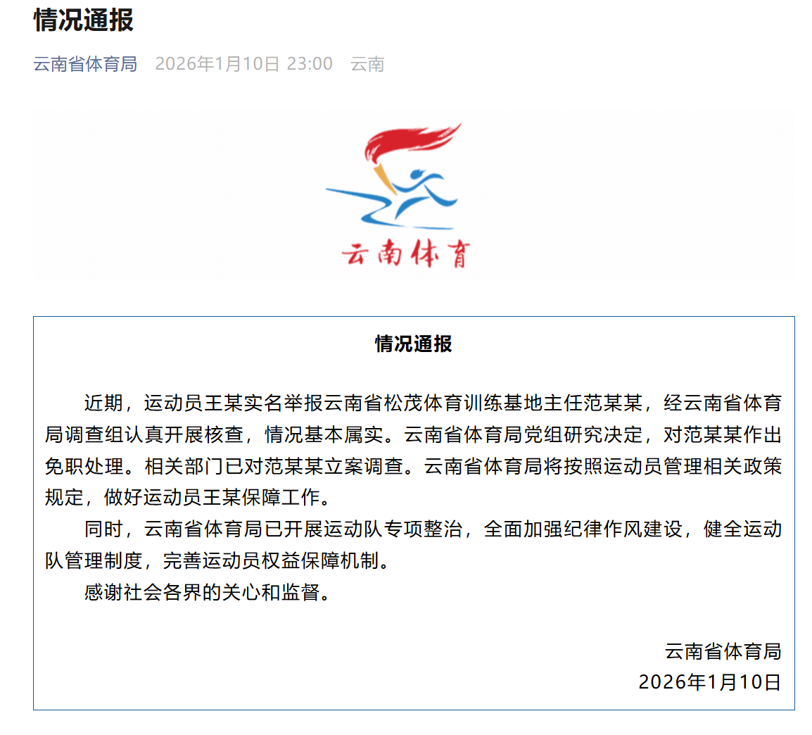 近期,运动员王某实名举报云南省松茂体育训练基地主任范某某,经云南省体育局调查组核查,情况基本属实。云南省体育局党组研究决定,对范某某作出免职处理。相关部门已对范某某立案调查。云南省体育局将按照运动员管理相关政策规定,做好运动员王某保障工作。同时,云南省体育局已开展运动队专项整治,全面加强纪律作风建设,健全运动队管理制度,完善运动员权益保障机制。