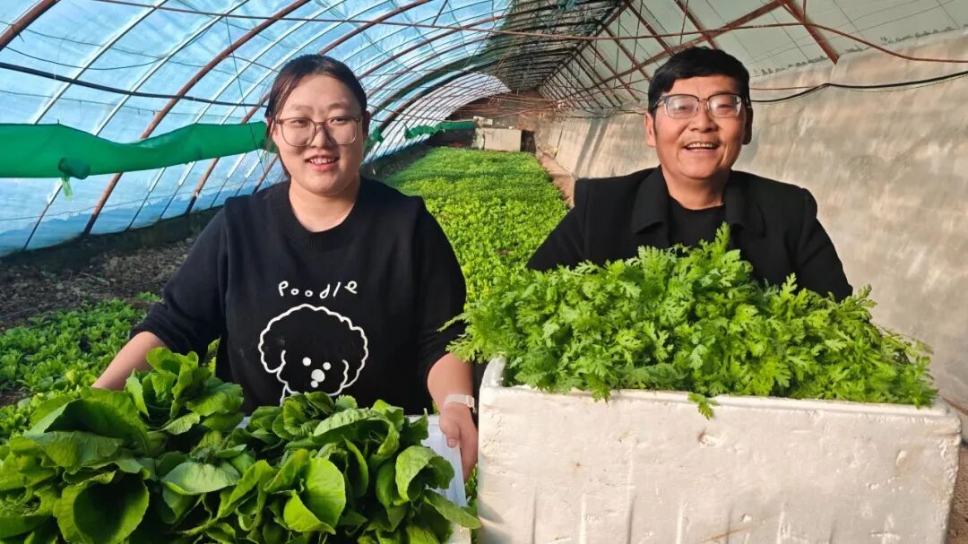 1月8日,新户镇三畦村的蔬菜大棚里,种植户手捧刚采收的鲜嫩蔬菜笑意盈盈。王子扬 摄