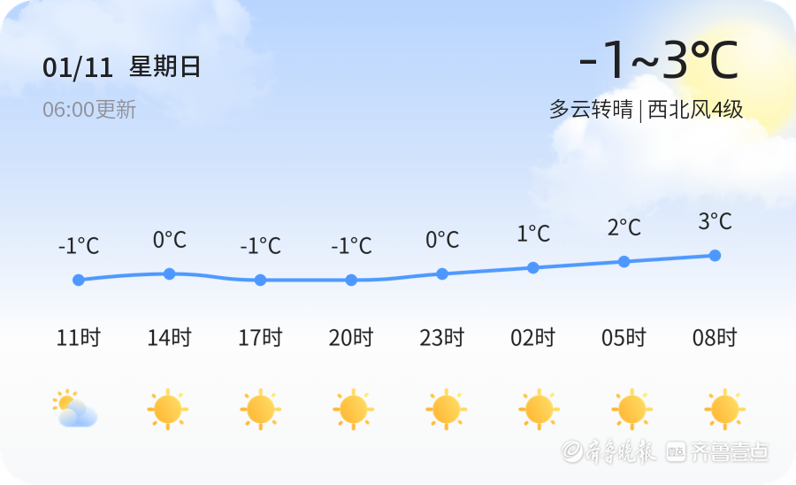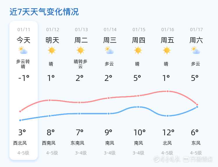 今天是2026年1月11日,农历十一月廿三。青岛市迎来多云转晴的天气,全市各区的气温在-1℃至3℃之间,西北风4级,空气湿度为36%,PM2.5指数为51,空气质量良好。市民朋友们可以感受到温和的天气,适合户外活动。各区的天气情况基本一致,均为多云转晴,气温较为平稳。明天的天气将有所变化,预计为晴天,气温将上升至1℃至8℃,较今日明显回暖。风力方面,明天将有西南风4-5级,风力稍有增强。市民朋友们可以感受到更加温暖的阳光,但需注意风力变化,做好防风准备。未来三天,青岛市的天气趋势总体平稳,最高气温将达到8℃,最低气温为-1℃。预计天气将以晴转多云为主,风力在3-4级左右。建议市民朋友们根据天气变化,适时增减衣物,尤其是早晚温差较大,注意保暖。此外,天气情况总体良好,适合安排户外计划。温馨提示