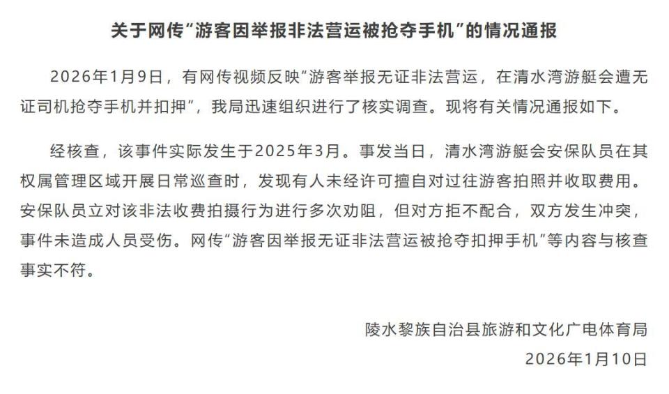 2026年1月9日,有网传视频反映“游客举报无证非法营运,在清水湾游艇会遭无证司机抢夺手机并扣押”,我局迅速组织进行了核实调查。现将有关情况通报如下。
