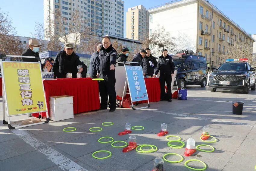 在活动主宣传区,情指中心、刑侦、治安、特巡警、禁毒等警种部门及县城派出所组成了“平安110”“反诈治骗厂”“治安小剧场”“反恐先锋号”“禁毒宣传角”等宣传阵营。通过拉横幅、发放宣传资料、现场展示、做游戏、有奖问答等形式,向群众普及各类安全防范知识。