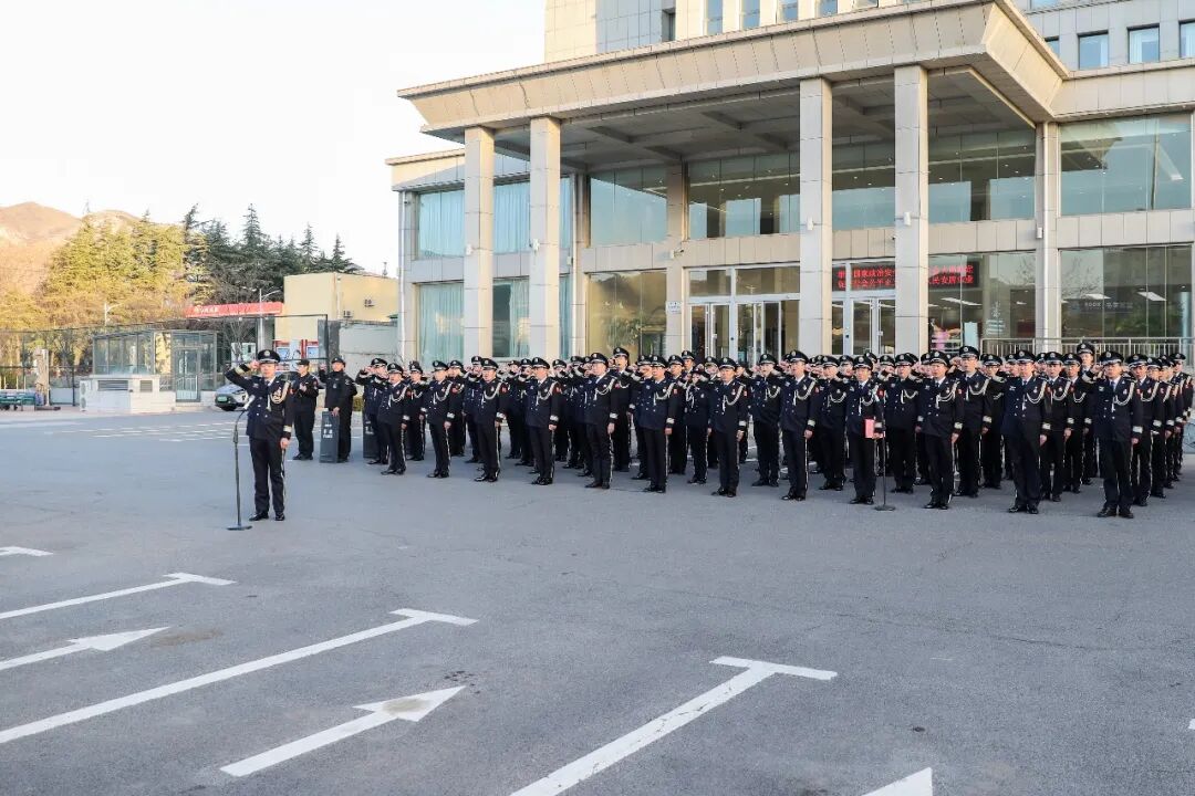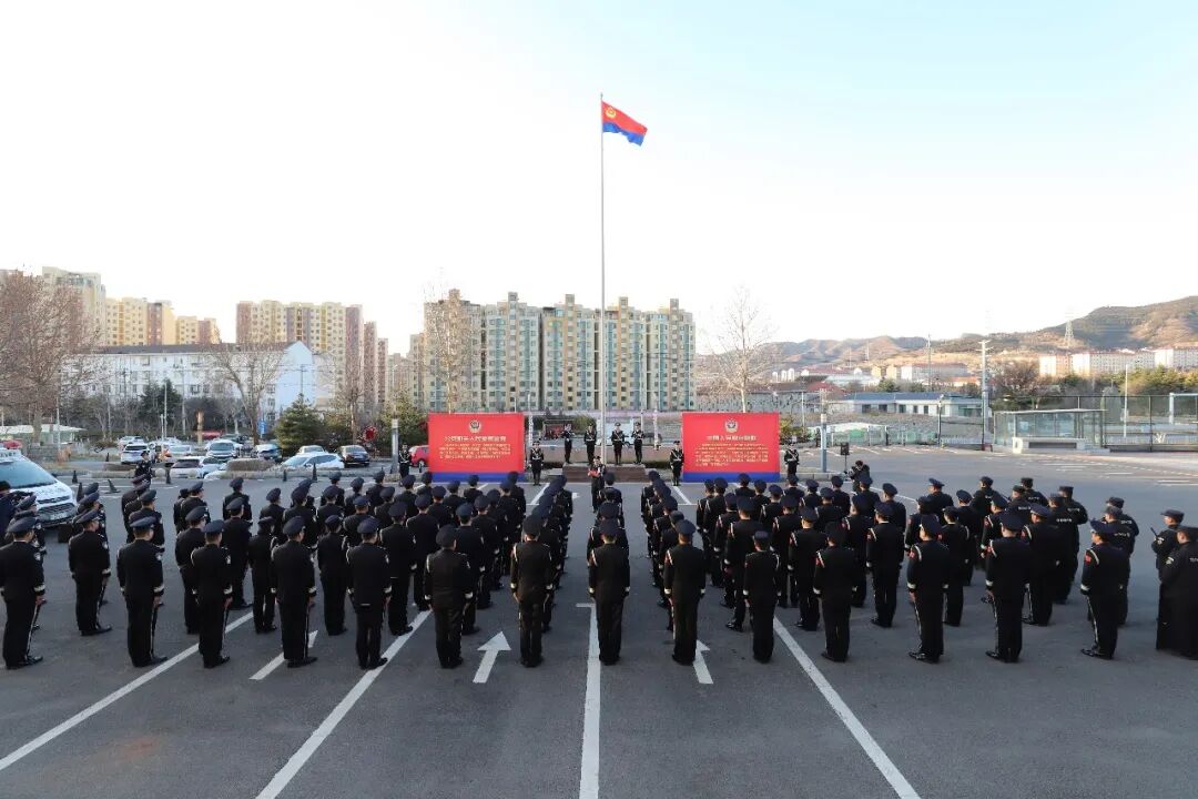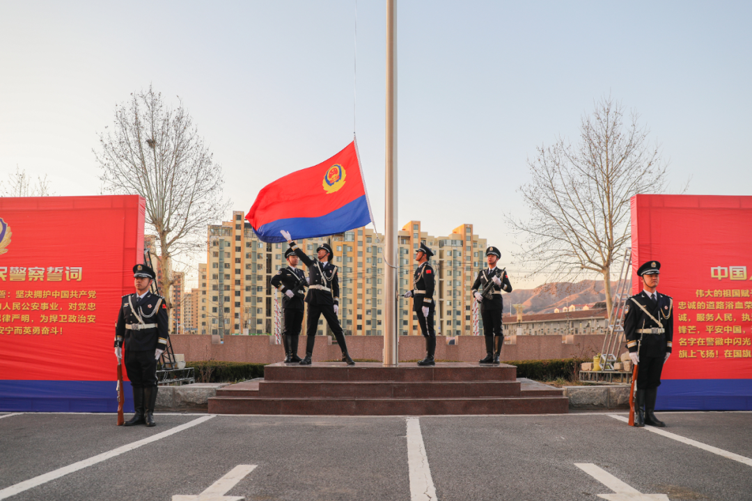 仪式现场气氛热烈,全体民警身着警礼服,精神抖擞,列队整齐。上午8时整,四名标兵分列在展板两侧、持枪伫立,在指挥员清晰洪亮的口令声中,仪仗队员迈着铿锵有力的步伐,护卫着中国人民警察警旗行进到升旗台。随着《中国人民警察警歌》振奋激昂的旋律响起,鲜艳的警旗迎着朝阳冉冉升起,全体民辅警向警旗庄严敬礼。