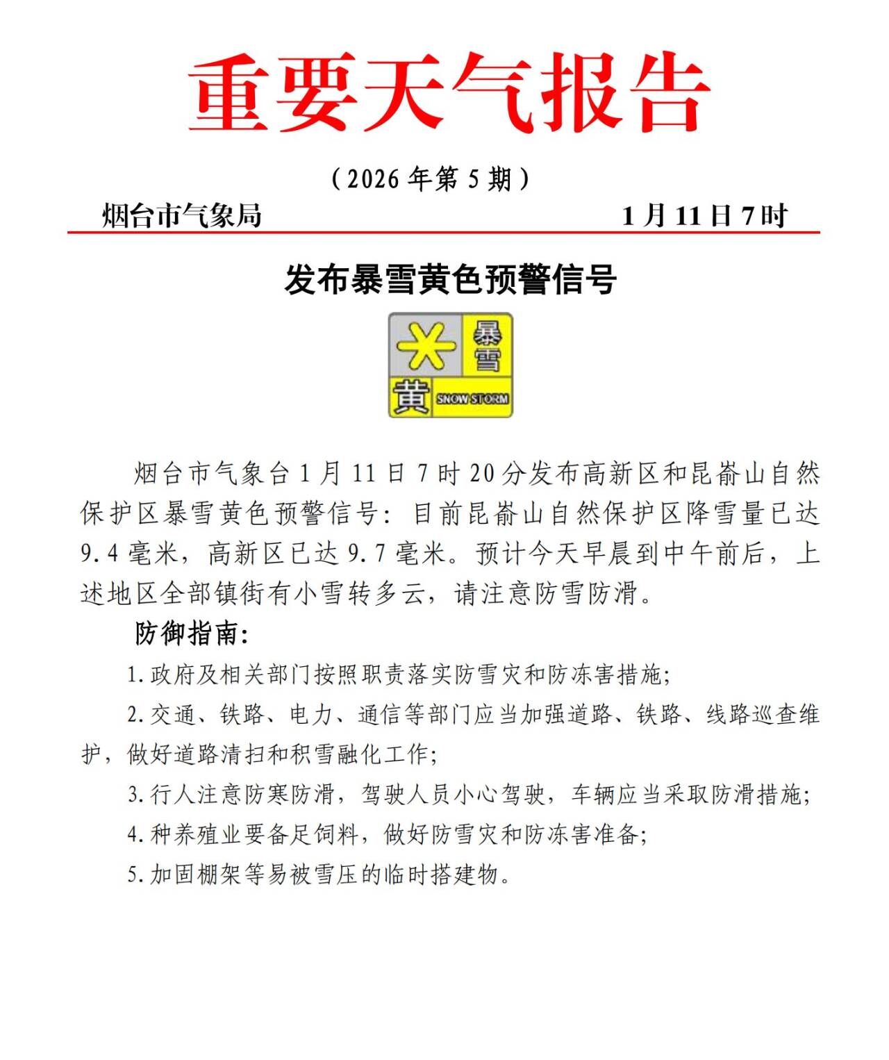 从烟台市气象台获悉,1月11日7时20分,市气象台发布高新区和昆嵛山自然保护区暴雪黄色预警信号:目前昆嵛山自然保护区降雪量已达9.4毫米,高新区已达9.7毫米。预计今天早晨到中午前后,上述地区全部镇街有小雪转多云,请注意防雪防滑。