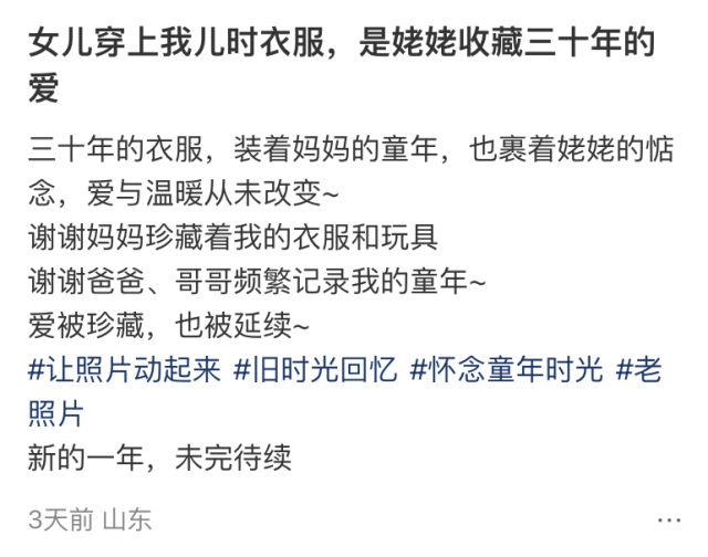 “女儿穿上我儿时的衣服,这是姥姥收藏了三十年的爱呀……”