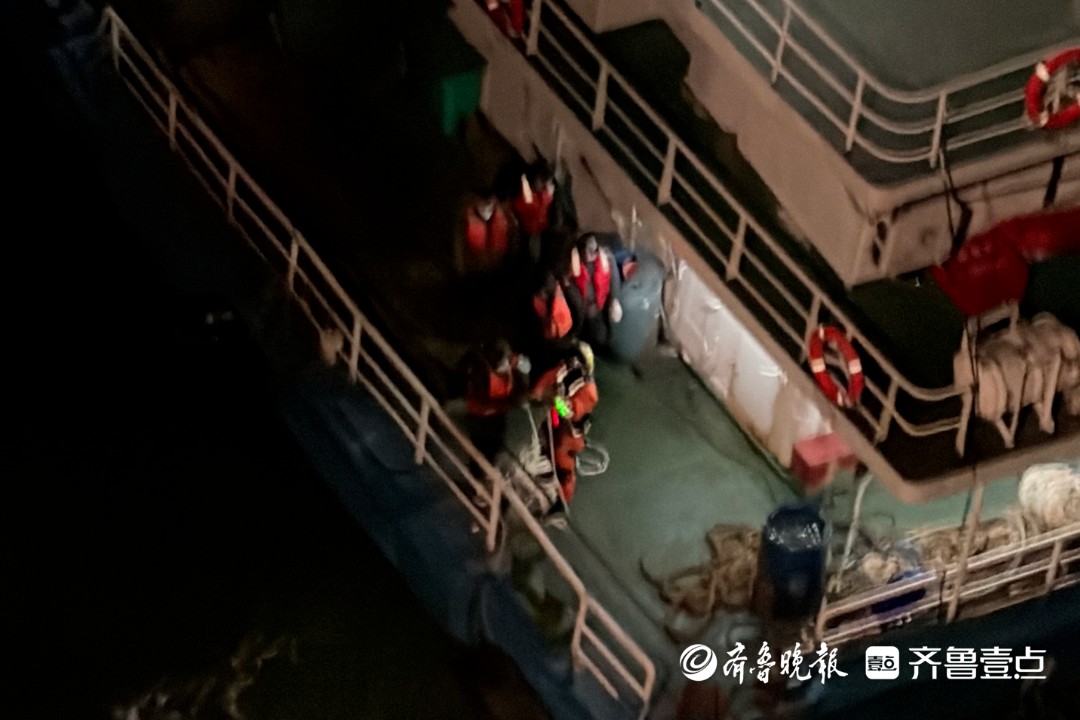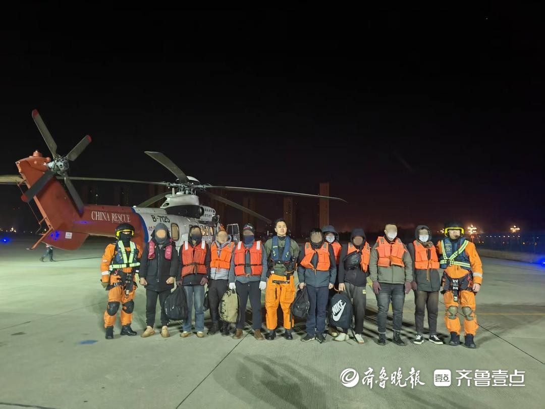“B-7125”机组人员密切协同,飞行员在暗夜环境中仅凭仪表、夜视仪和搜索灯,在强风中操纵直升机稳定悬停于遇险船舶上空;绞车手紧盯救生员作业状态精准操纵机载绞车设备,救生员克服强风扰动、吊运空间狭小和船舶大幅摇摆等困难,快速降落于甲板。遇险船员因身处险境情绪激动,增加了机组作业难度。现场用时约20分钟,机组经过9次甲板吊运作业,顺利将9名船员转移至机舱。两架直升机随即返航,降落于山东烟台蓬莱沙河口机场。目前,9名船员状态良好。