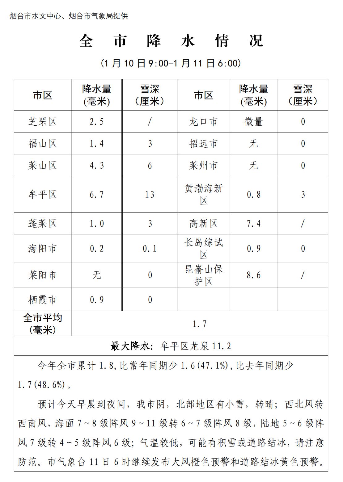 受较强冷空气影响,1月10日起烟台迎来新一轮降雪,虽然10日白天降雪总量不是很大,但是经过一夜的降雪之后,烟台市区11日已出现明显的积雪。截至目前,全市降水情况咋样,雪深如何?11日早上,烟台市水文中心、烟台市气象局联合发布全市最新降水情况。
