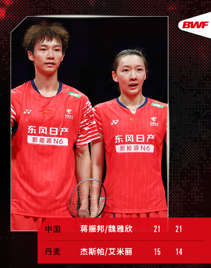 随后,另一对中国组合蒋振邦/魏雅欣以21-15和21-14同样直落两局,战胜了丹麦组合杰斯帕·托夫特/艾米丽·马厄隆,同样拿到决赛席位。