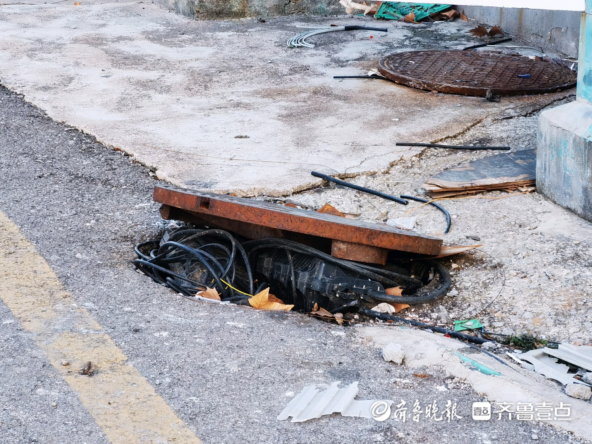 情报站·随手拍|济南建设路一井盖翘起线缆外露,影响市容存隐患