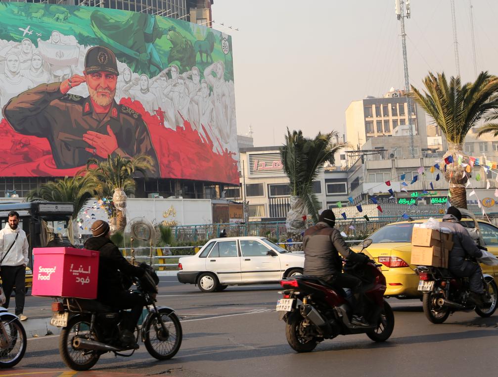 6日,在伊朗首都德黑兰街头,车辆经过一幅绘有伊遇袭身亡的高级将领卡西姆·苏莱曼尼形象的宣传海报。新华社