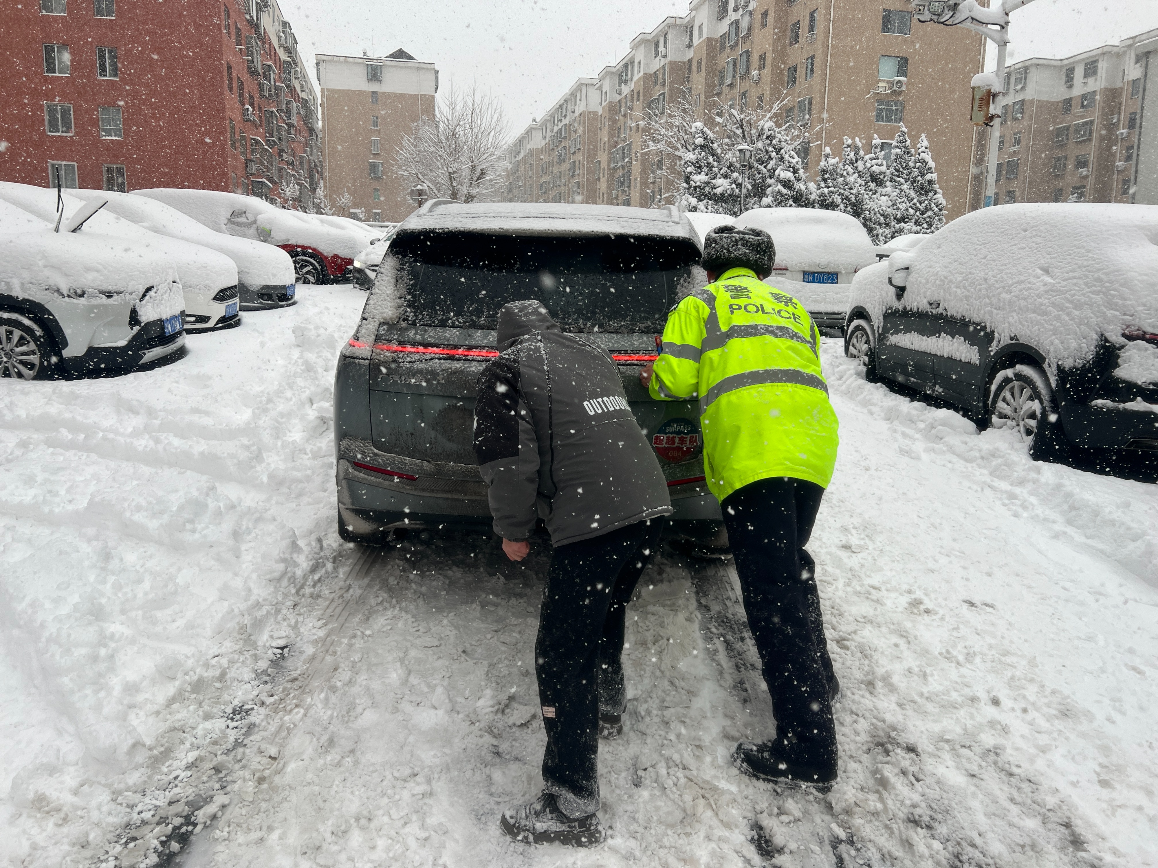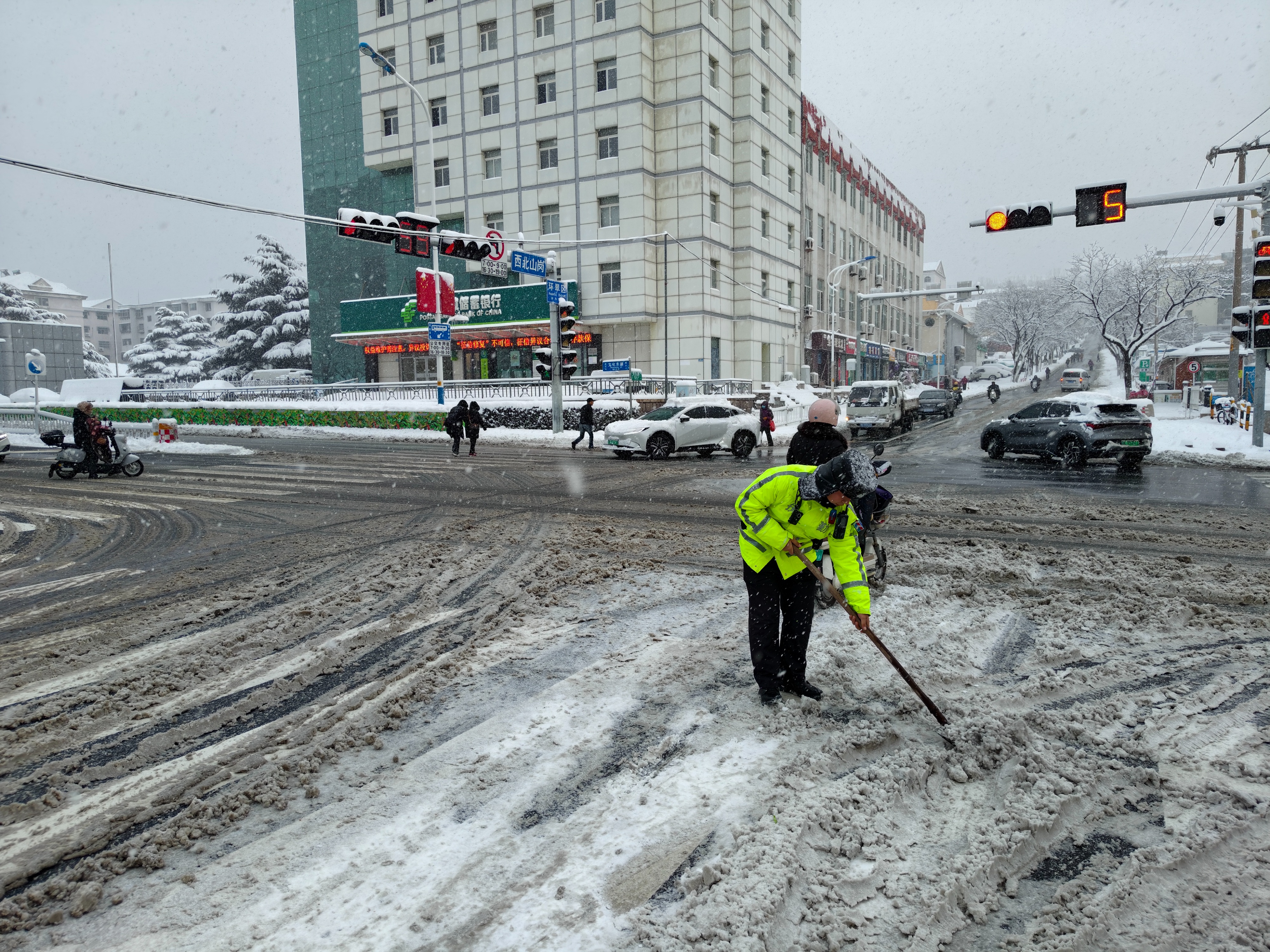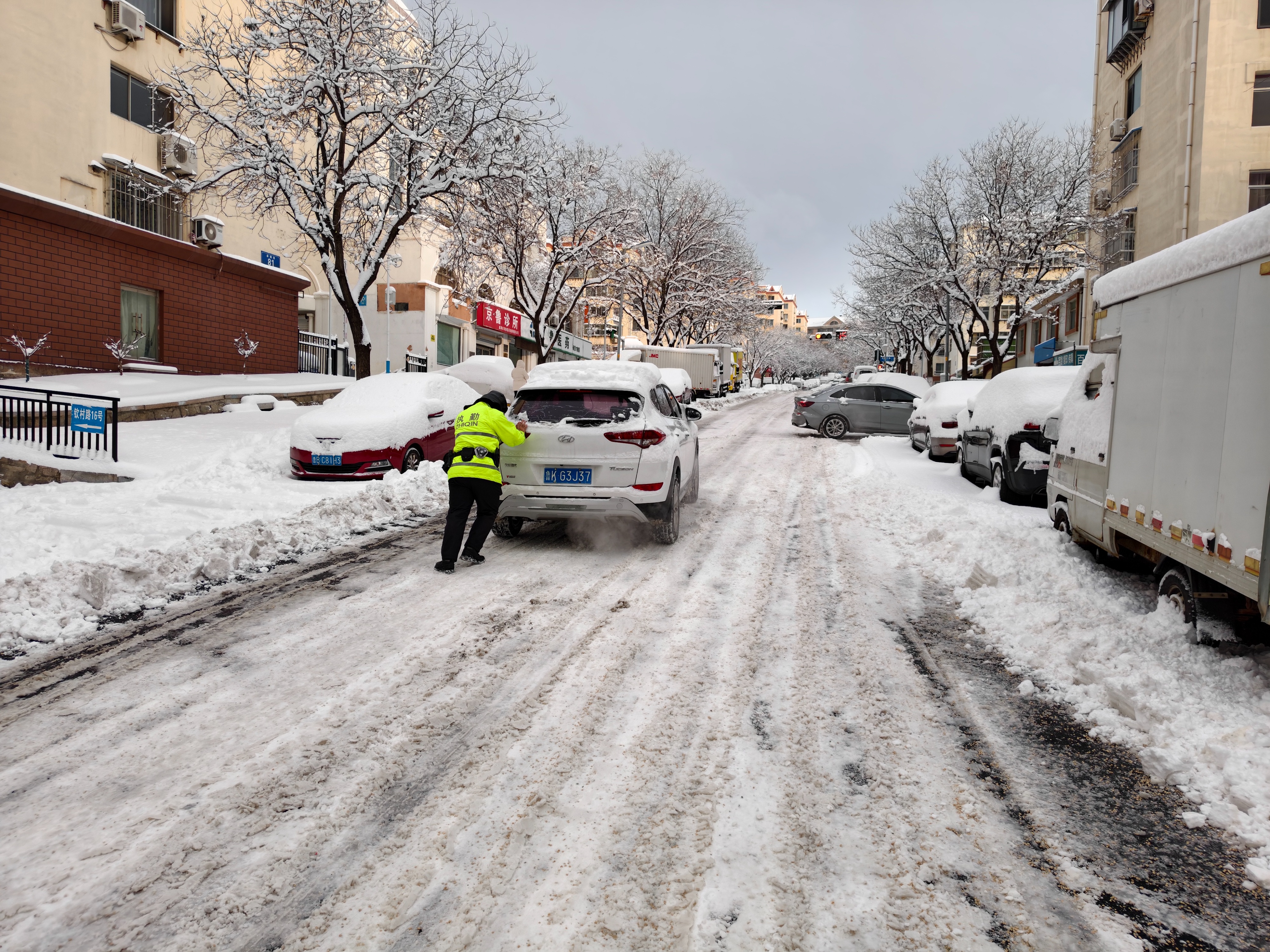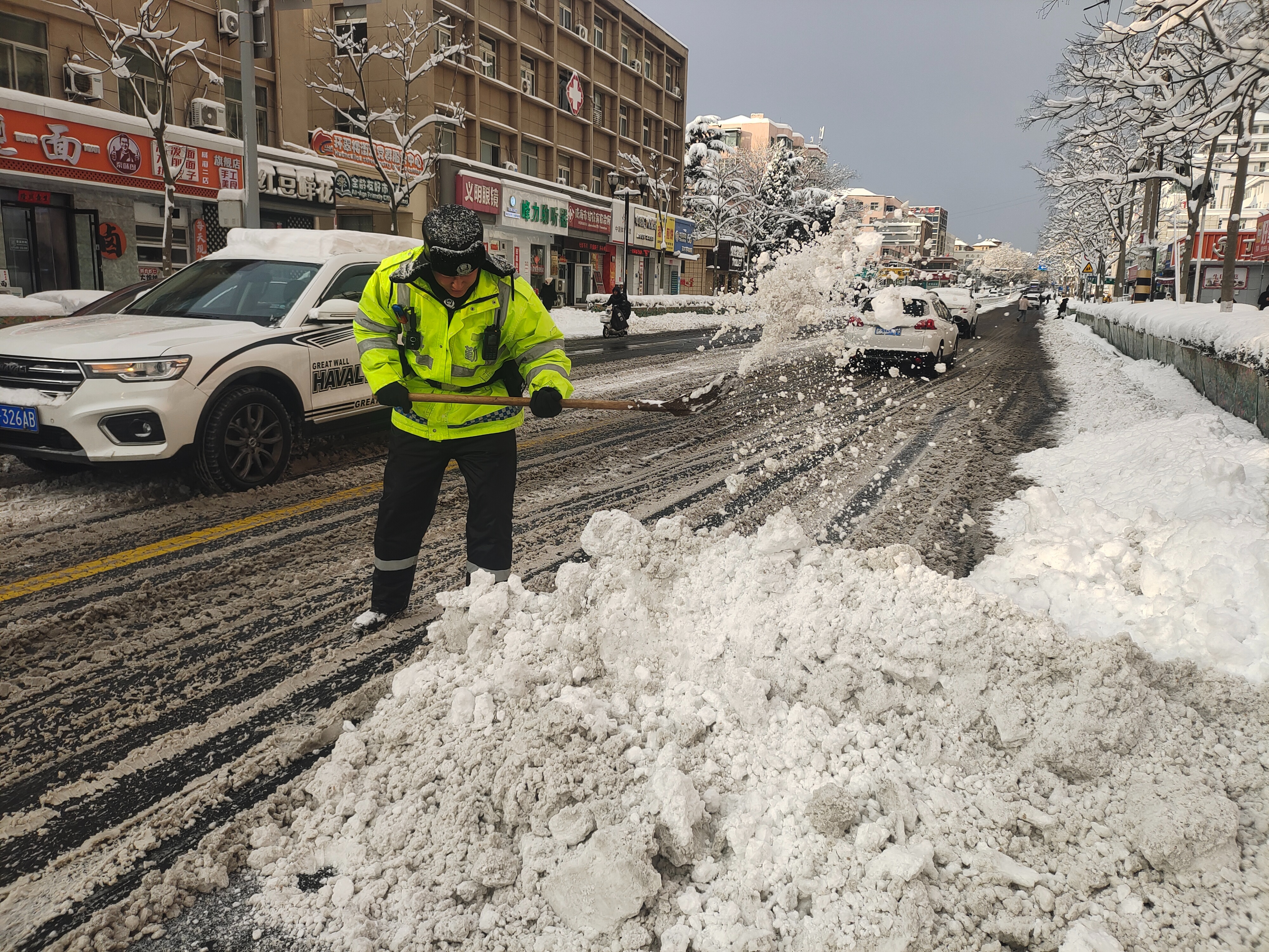 1月11日上午,威海交警在路面疏导交通并协助清雪工作。1月11日早晨,威海市气象台变更发布暴雪橙色预警信号、道路结冰橙色预警信号。威海交警提醒:降雪和低温天气对道路通行影响持续,非必要不出行,出行前驾驶人请提前关注最新路况信息,合理规划出行时间及路线。(刘顺)