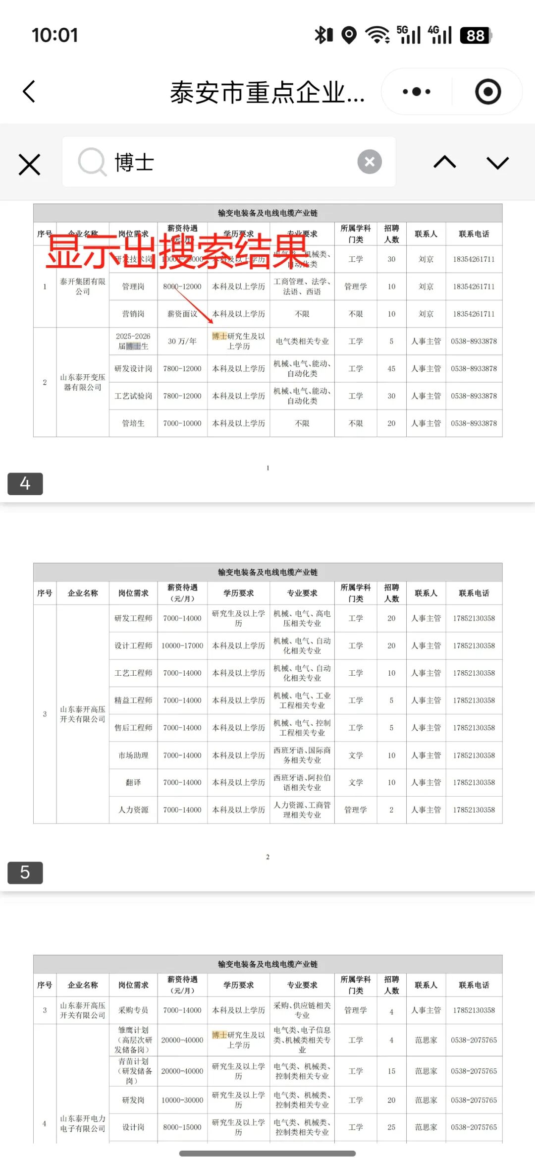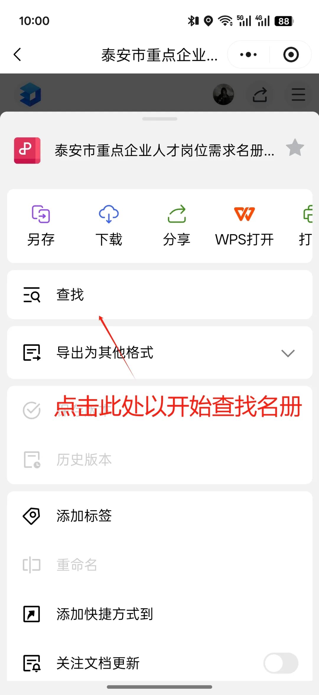 点击下拉菜单中的“查找”,输入关键词即可查找相关岗位,比如,输入“博士”,文档就可以定位到博士学历的相关岗位;输入“人工智能”即可找到人工智能专业相关岗位;也可检索企业名称、薪资待遇等关键词查询岗位信息。