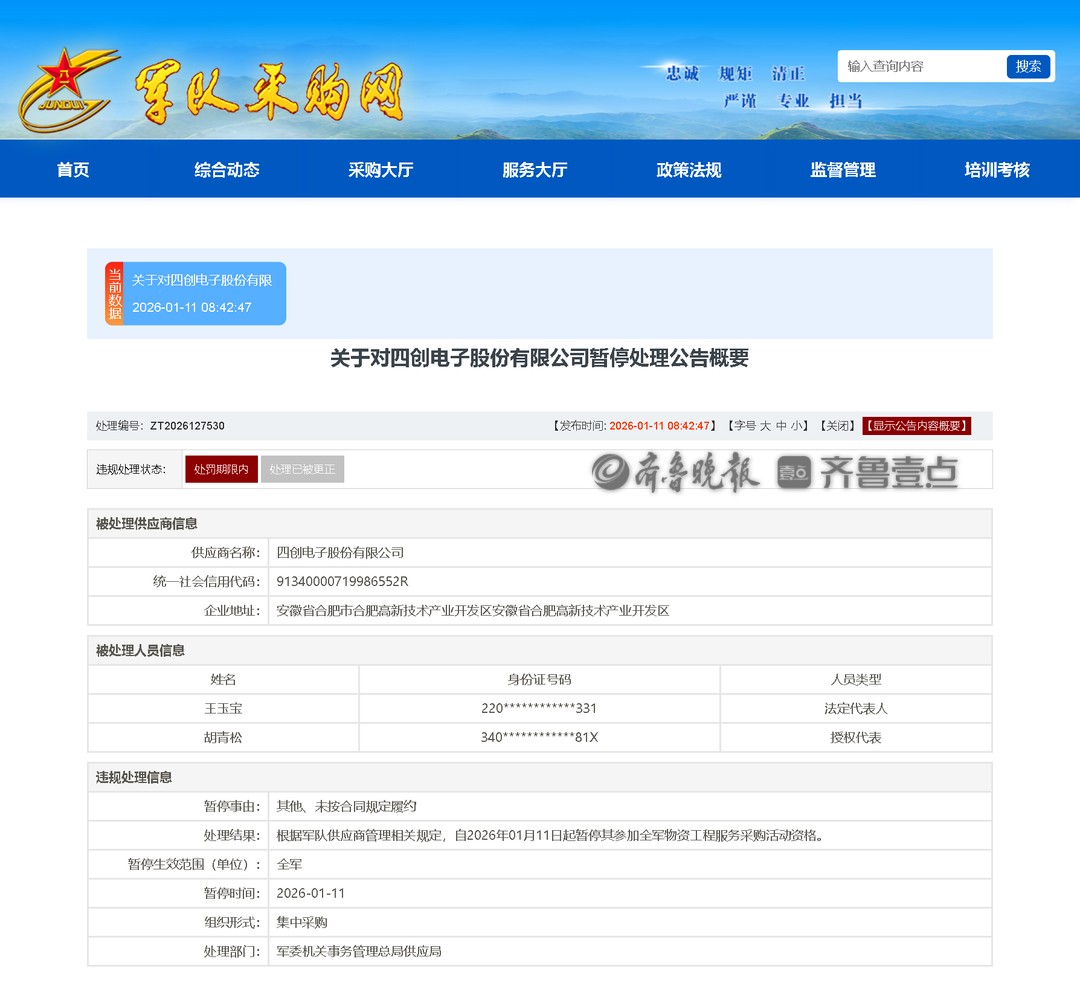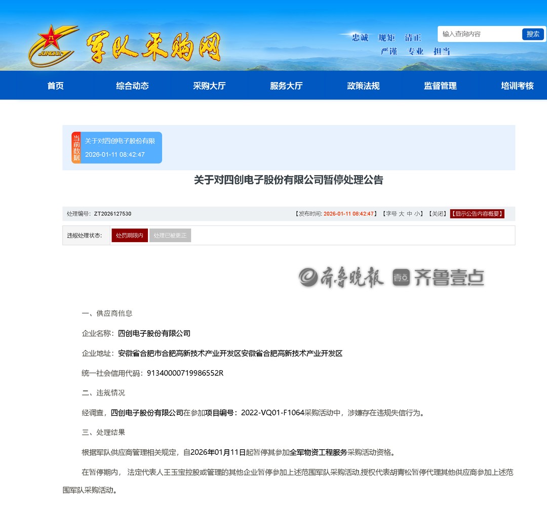 近日,军队采购网发布关于对四创电子股份有限公司(四创电子 600990)暂停处理公告。
