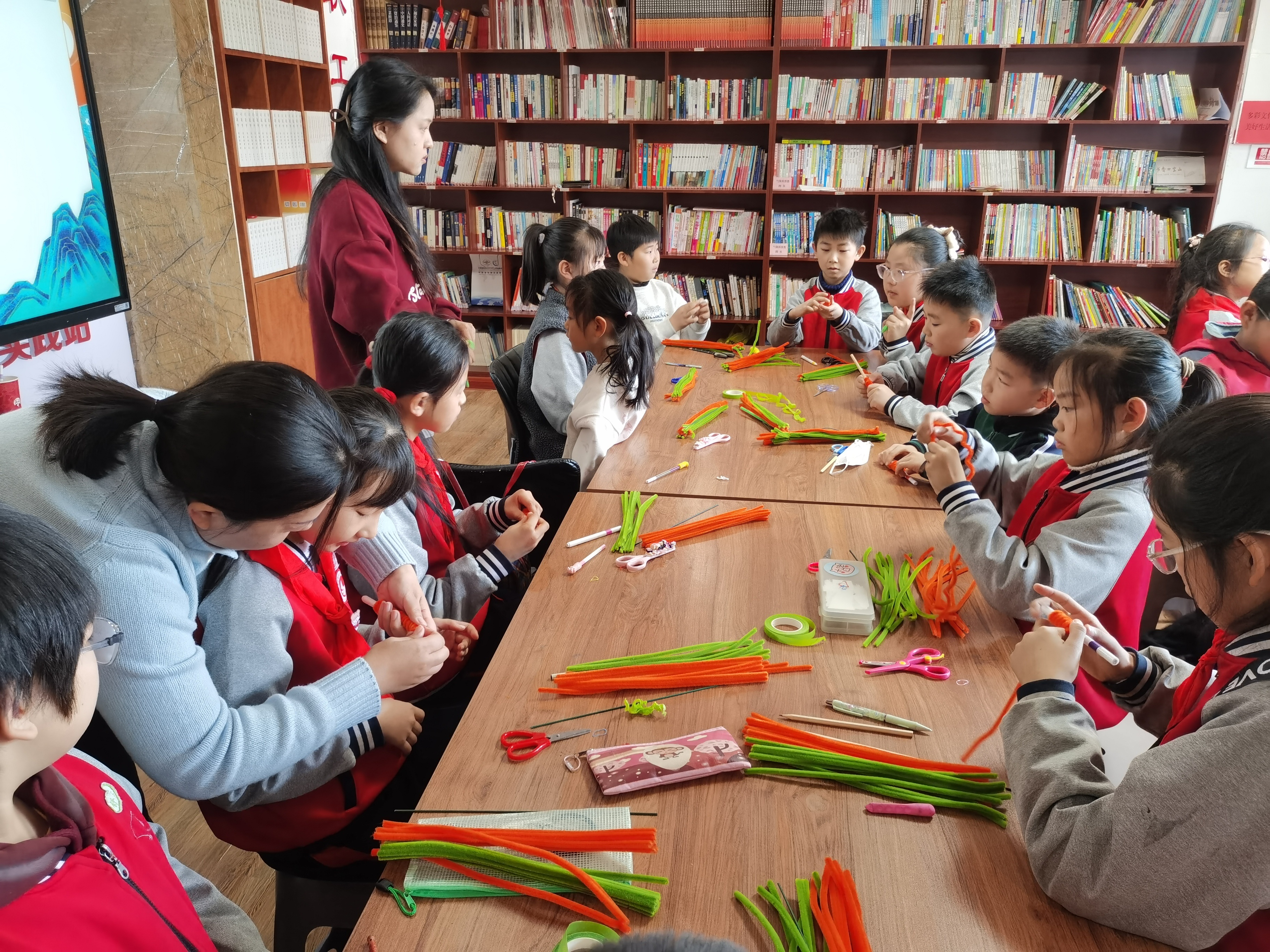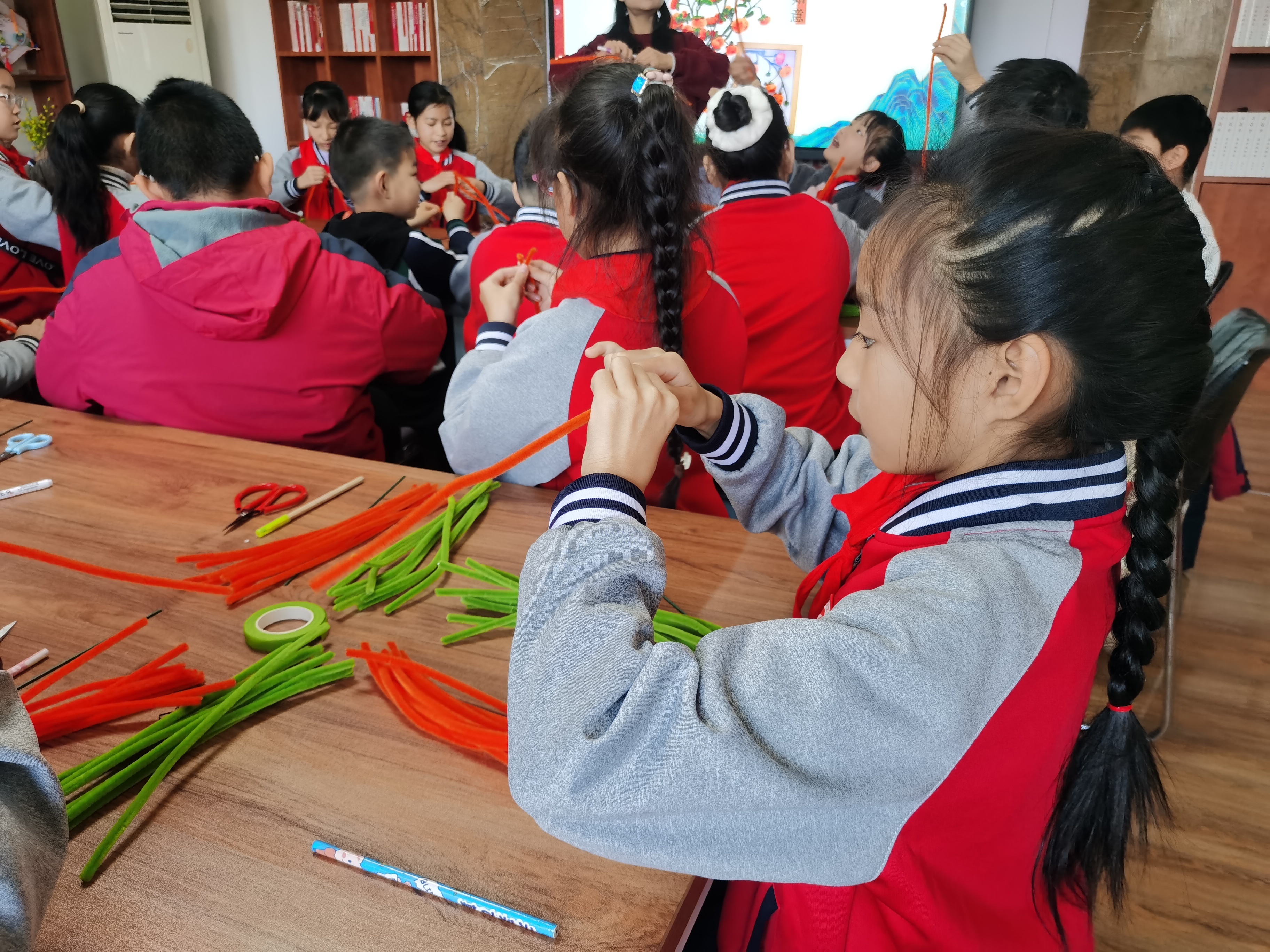 当日上午,万杰路社区的活动室内热闹非凡。社区工作人员与高新区实验小学的师生们齐聚一堂,共同投入到扭扭棒“柿柿如意”的手工制作中。
