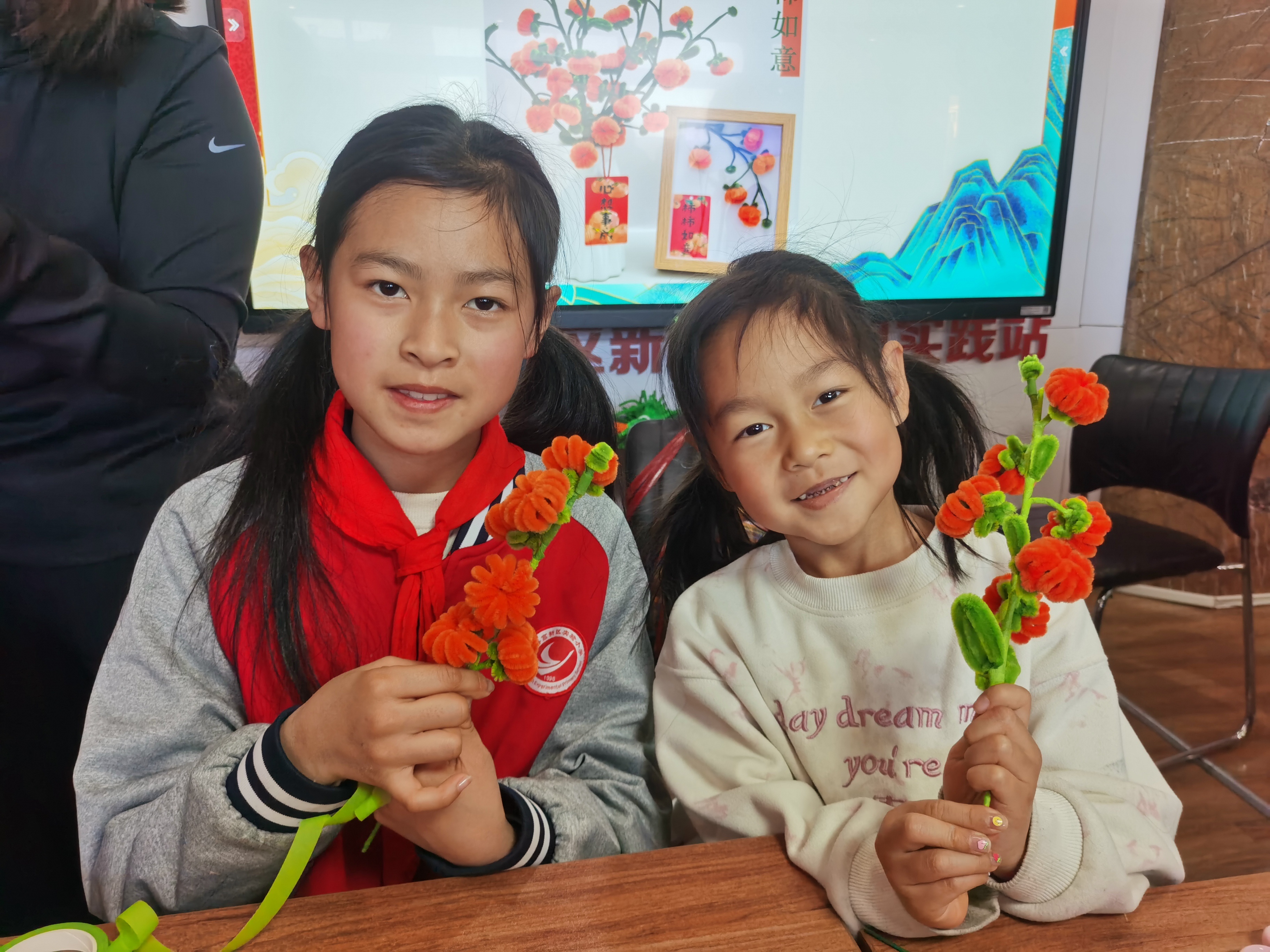 在工作人员的指导下,孩子们和家长一起动手,将一根根普通的扭扭棒变成了栩栩如生的“柿子”。这些“柿子”形态各异,色彩鲜艳,寓意着事事如意,寄托了大家对新一年的美好祝愿。