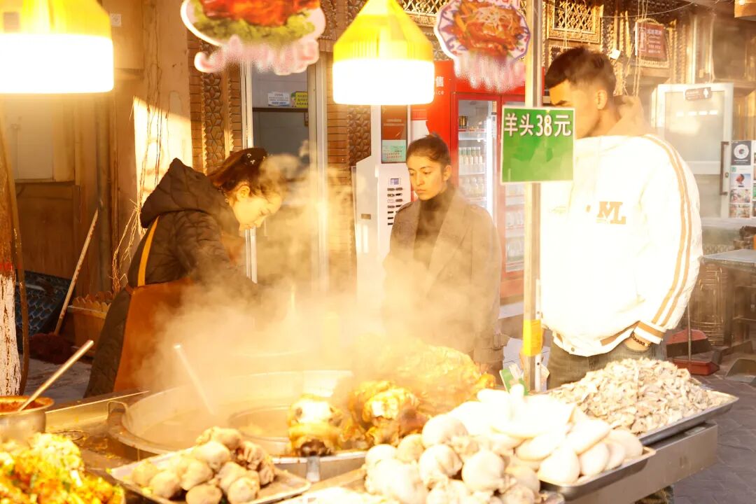 走出“古丽的家”,阿孜古丽的镜头追着羊肉香气,停在汗巴扎的一家缸子肉摊前。店主打开刚煮好的缸子肉盖子,一股浓郁肉香裹挟着胡萝卜的清甜瞬间溢出。“来来来,姑娘娃娃、老人小孩都爱喝,今天天冷,来上一缸,舒服得很!”摊主大叔说着略带口音的普通话热情吆喝。直播间评论区瞬间热闹起来,“隔着屏幕都闻到香味了”“好想飞去喀什”“喀什太美了”等留言不断刷屏。