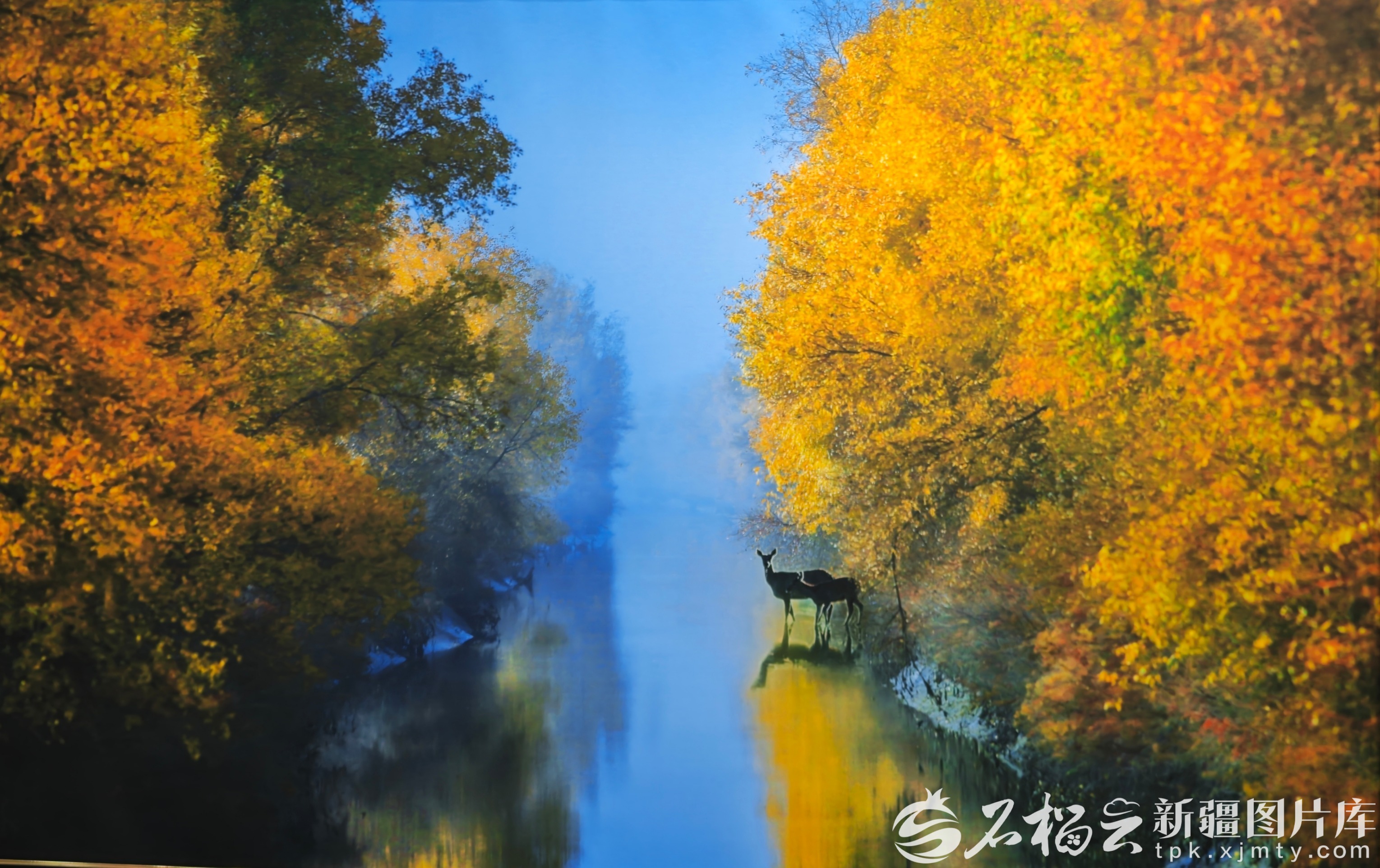 马光义摄影作品《秋林鹿影》。记者 宋海波摄