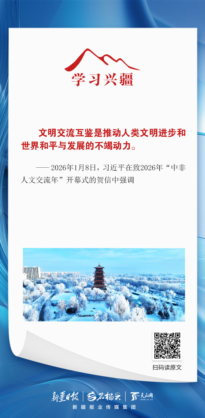 学习兴疆丨文明交流互鉴是推动人类文明进步和世界和平与发展的不竭动力天山网 2026-01-11 18:51:27文明交流互鉴是推动人类文明进步和世界和平与发展的不竭动力。——2026年1月8日,习近平在致2026年“中非人文交流年”开幕式的贺信中强调责任编辑:帕提姑丽·牙森