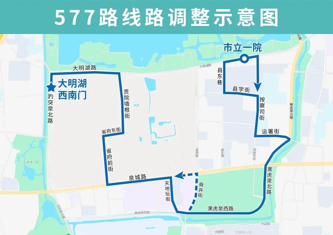 577路由大明湖西南门开往市立一院,优化调整后途经趵突泉北路、大明湖路、贡院墙根街、省府东街、省府前街、泉城路、天地坛街(上行舜井街)、黑虎泉西路、黑虎泉北路、运署街、按察司街,然后单向沿县学街向西、县东巷向北、大明湖路向东至按察司街向南恢复原线,沿途设置大明湖西南门、贡院墙根街大明湖路、芙蓉街西、柒坊巷、芙蓉街、天地坛街(路北)、舜井街、黑虎泉、青龙桥南、青龙桥北、泉城中学、大明湖街道办事处、县东巷县学街(路东)、市立一院(路南)、按察司街北口(路西)站点。