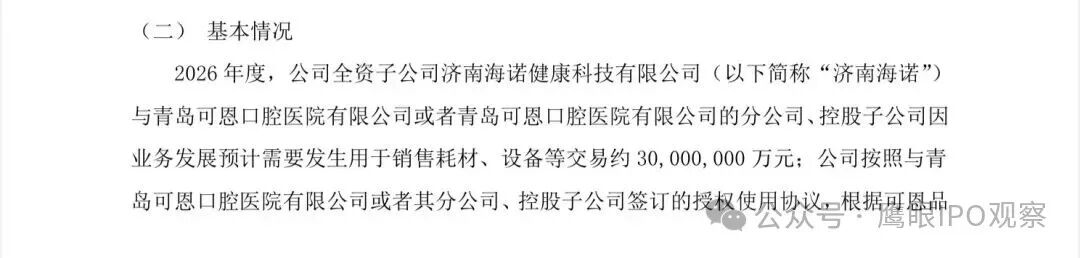 从具体交易安排看,2026年度,可恩口腔全资子公司济南海诺健康科技有限公司(下称“济南海诺”)将与多家“可恩系”口腔医疗机构产生耗材、设备销售及品牌授权等相关交易。