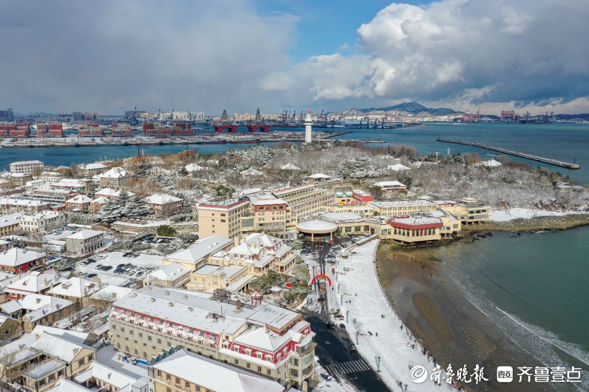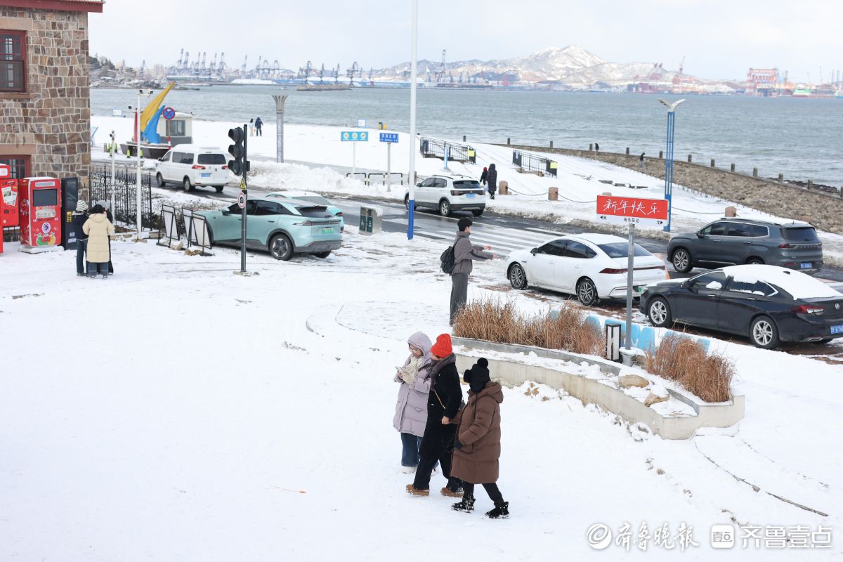 图集|“雪窝”烟台迎今冬最强降雪,游客在滨海广场踏雪听海