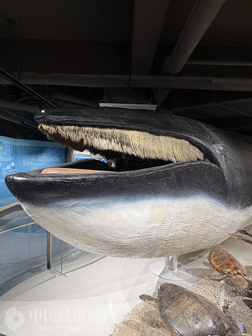 “这是我们的‘镇馆之宝’。”讲解员介绍道,“这些看似柔软的‘滤网’,实则是从牙齿演化而来的生存利器,布氏鲸就是靠它过滤海水中的小鱼小虾为食。”