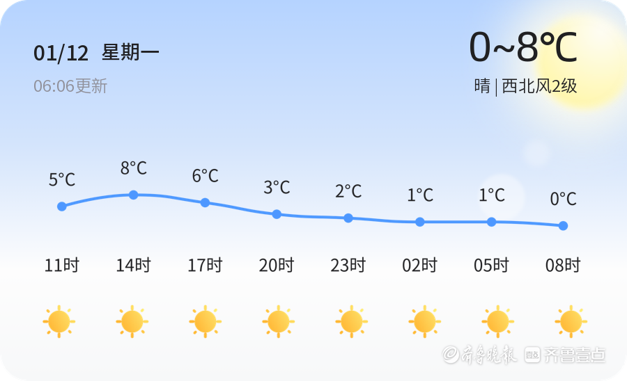 今天是1月12日,星期一,农历十一月廿四。日照市迎来晴好天气,气温在0℃到8℃之间,西北风2级,空气质量为良。市民出行请注意保暖,建议佩戴口罩以应对干燥天气。今天的PM2.5指数为51,属于良好水平,适宜户外活动。