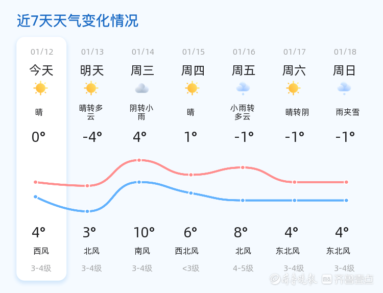 预计明天(1月13日),威海市天气将由晴转多云,气温有所下降,最低气温为-4℃,最高气温为3℃。相比今天,明天的天气更加寒冷,北风3-4级,市民需提前做好防寒准备。